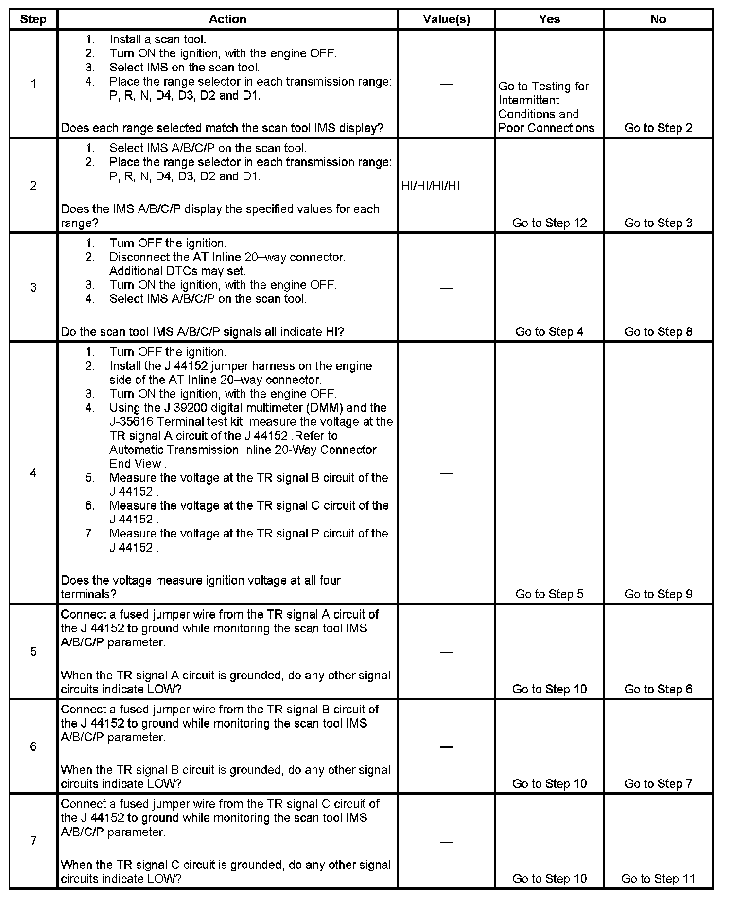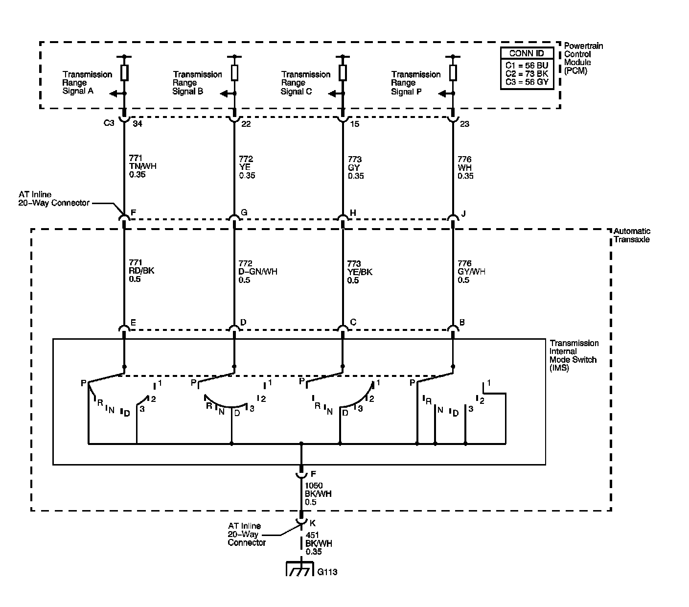 The transmission internal mode switch (IMS) is a sliding contact switch attached to the selector detent inside the transmission side cover. The four inputs to the PCM indicate the position of the transmission range selector. The input voltage level at the PCM is high, B+, when the IMS is open and low when the switch is closed to ground. The four input parameters represented are Signals A, B, C and P, Parity. Refer to Transmission Internal Mode Switch Logic.