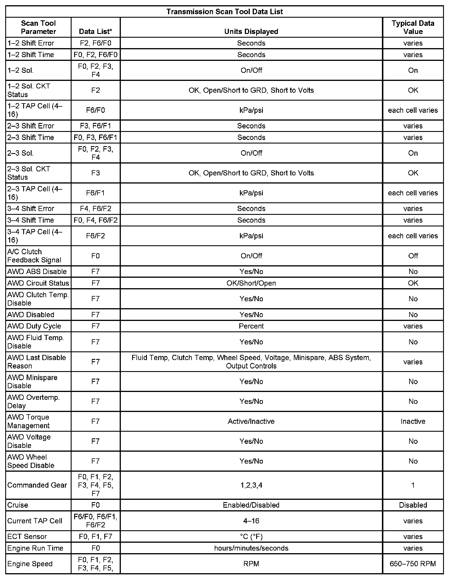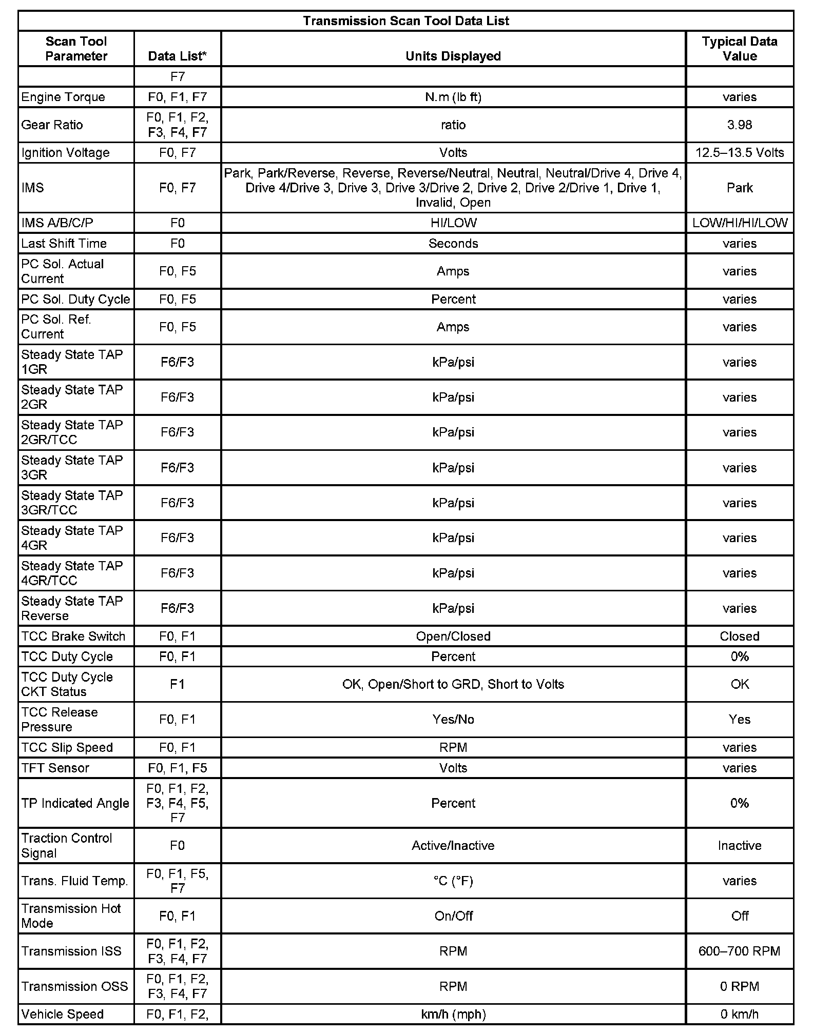 Only the parameters listed below are used in this manual for diagnosing. If a scan tool displays other parameters, the values are not recommended by General Motors for use in diagnosis.