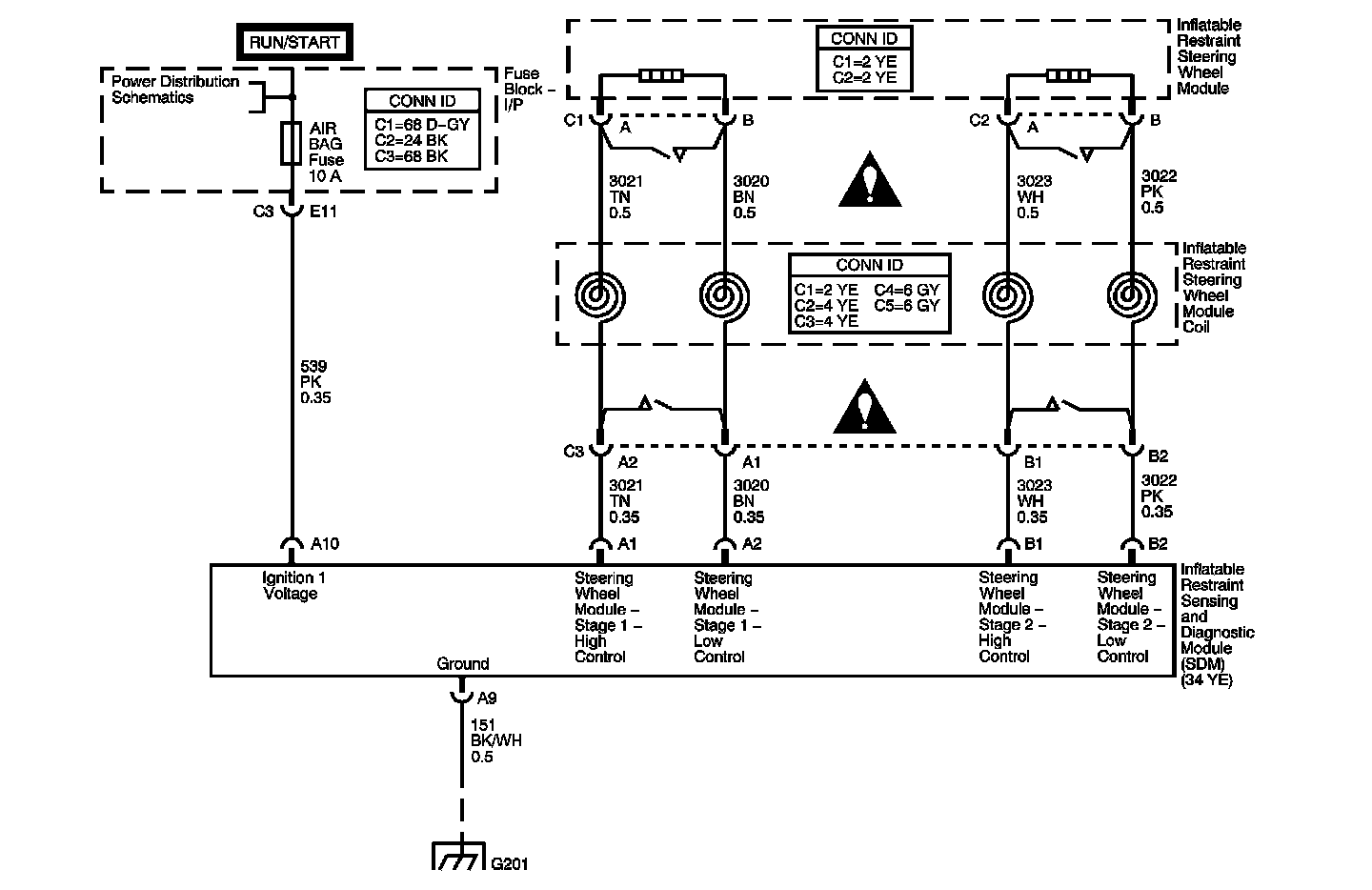The driver frontal deployment loop consists of the dual stage inflatable restraint steering wheel module, the inflatable restraint steering wheel module coil, and the steering wheel module high and low circuits for both stages 1 and 2. Two shorting bars used within the steering wheel module coil connector short together both the steering wheel module stage 1 high and low circuits, and the steering wheel module stage 2 high and low circuits when the connector is disconnected. This helps to prevent unwanted deployment of the inflator module during servicing. During a frontal crash of sufficient force the inflatable restraint sensing and diagnostic module (SDM) allows current to flow through the deployment loop in order to deploy the steering wheel module. When the ignition is turned ON, the SDM performs continuous diagnostic tests on the deployment loops to check for proper circuit continuity and for shorts to ground or voltage. If a malfunction is detected, a diagnostic trouble code (DTC) will be stored in memory.