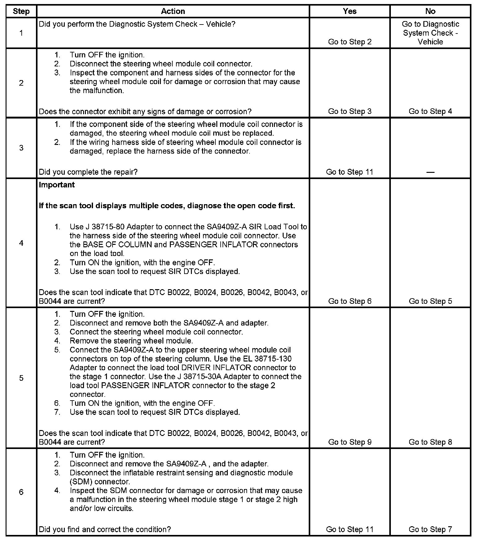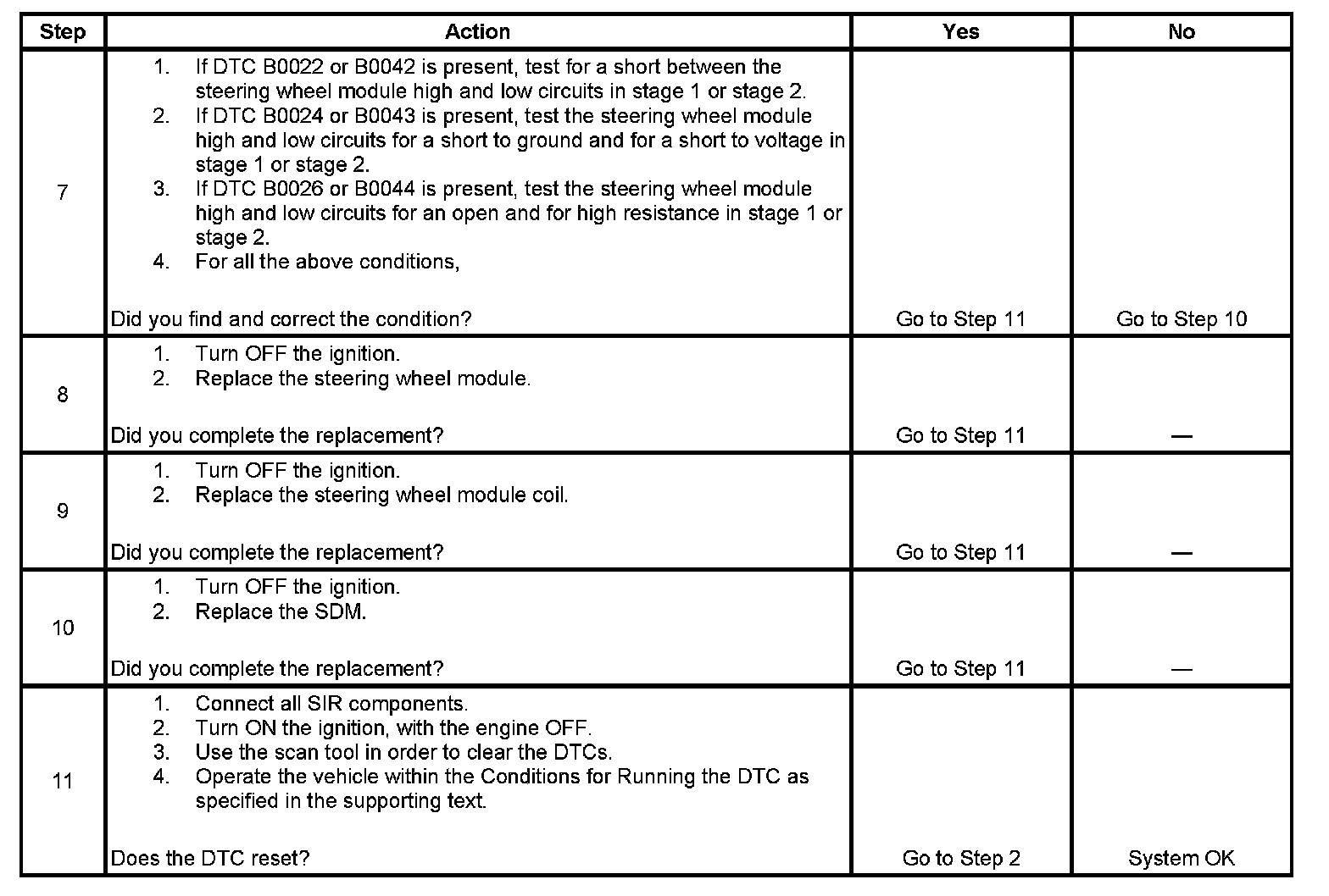 7. Tests to see what DTCs are present. If DTC B0022 or B0042 is present, test for a short between the steering wheel module high and low circuits in stage 1 or stage 2. If DTC B0024 or B0043 is present, test the steering wheel module high and low circuits for an open and for high resistance in stage 1 or stage 2. If DTC B0026 or B0044 is present, test the steering wheel module high and low circuits for an open and for high resistance in stage 1 or stage 2.