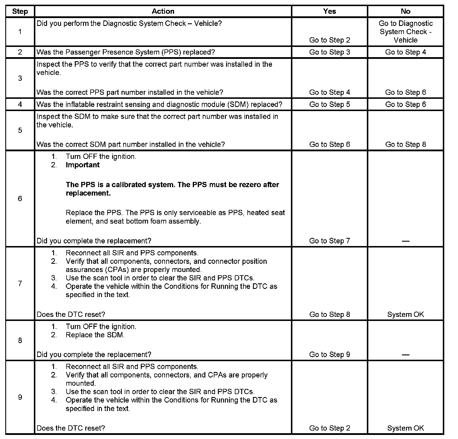 When the ignition is turned ON, the inflatable restraint sensing and diagnostic module (SDM) performs tests to diagnose critical malfunctions within itself. When the SDM has completed the power-up mode, the SDM will establish communication with the Passenger Presence System (PPS). The PPS will respond by commanding both of the PASSENGER AIR BAG ON/OFF indicators ON for 5 seconds. The SDM will then transmit a request message to the PPS to receive the PPS verification ID. The PPS will transmit the verification ID to the SDM, and the SDM will compare the ID received to data stored in memory. If the data stored in memory does not match the information transmitted by the PPS, the SDM will set DTC B0098 and command the AIR BAG indicator ON.