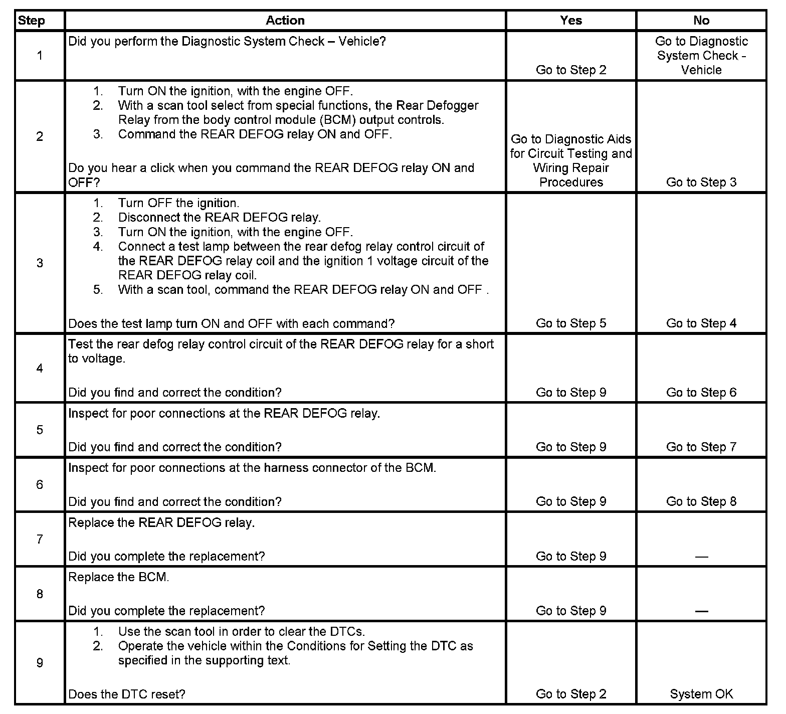 The body control module (BCM) monitors the rear defogger switch input. When the rear defogger is turned on, rear defog switch closed, the BCM grounds the coil side of the rear defog relay. This will energize the relay activating the rear defogger.