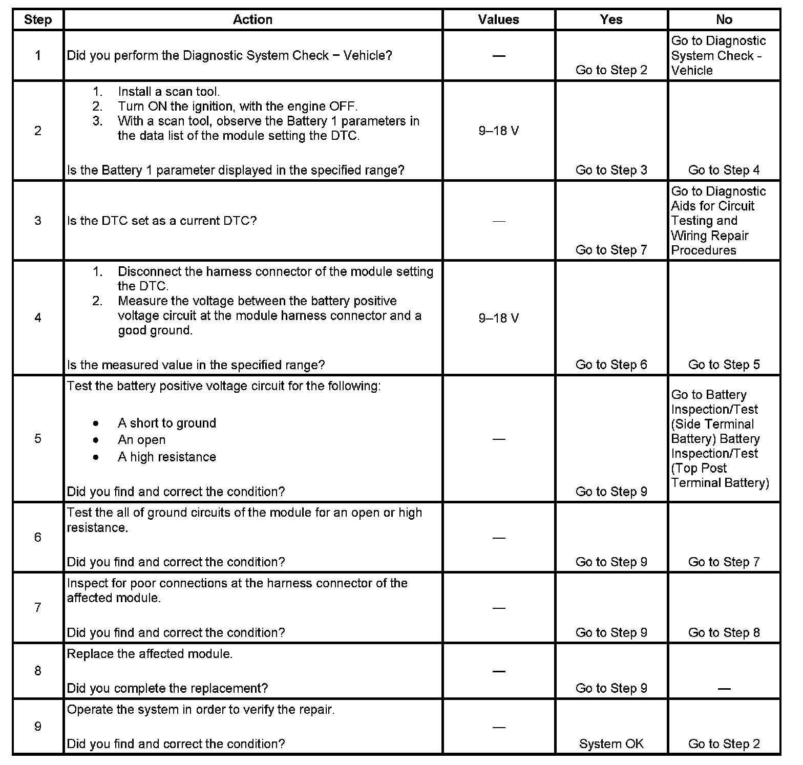 Sets if the BCM detects a system voltage below 9 volts and the condition is present at least 5 seconds.