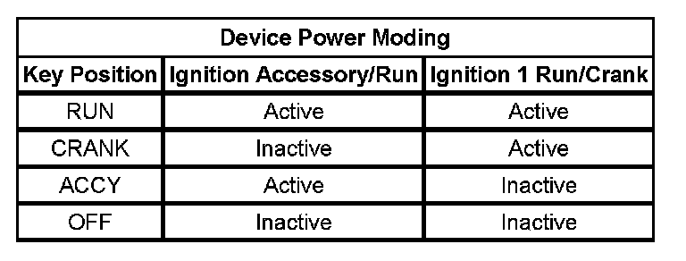 Normal vehicle class 2 communication will not commence until the system power mode has been identified. The body control module (BCM) communicates the system power mode to all the modules connected to the class 2 serial data circuit. The BCM monitors the state of the ignition 1 voltage circuit, accessory voltage circuit and the engine run flag (ERF) in order to determine the present system power mode. The ERF is a serial data message from the engine controller.