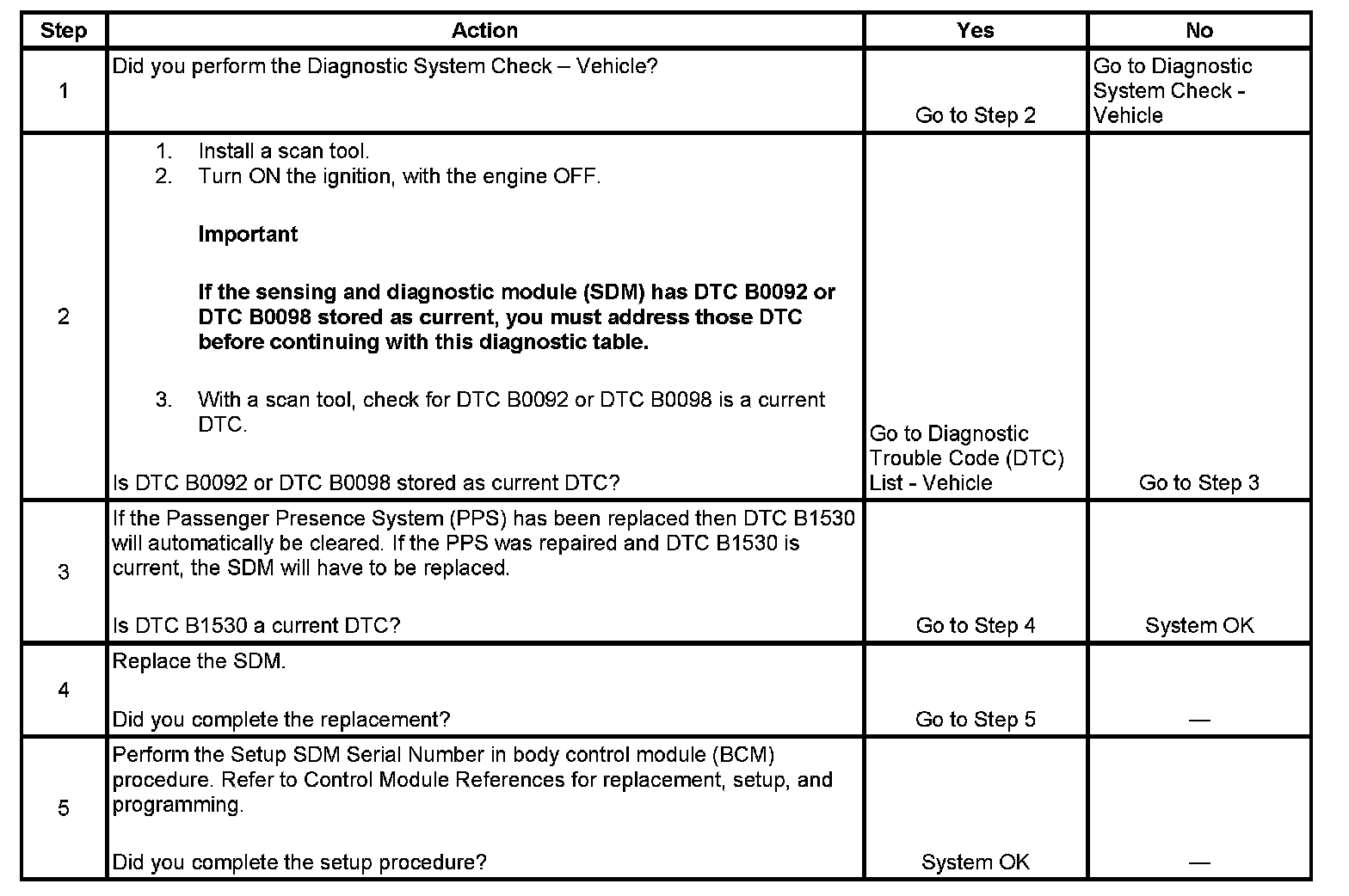 IMPORTANT: DTC B0092 or DTC B0098 will set if the PPS has a malfunction, and has set any one of the following DTC: 032, 034, 036, 052, or 056. When DTC B0092 or DTC B0098 is present, it is important to check the PPS for any current DTC. Refer to Passenger Presence System Flash Code Procedures. If the PPS has any current DTC address those DTC before performing this DTC chart. Reading and Clearing Diagnostic Trouble Codes