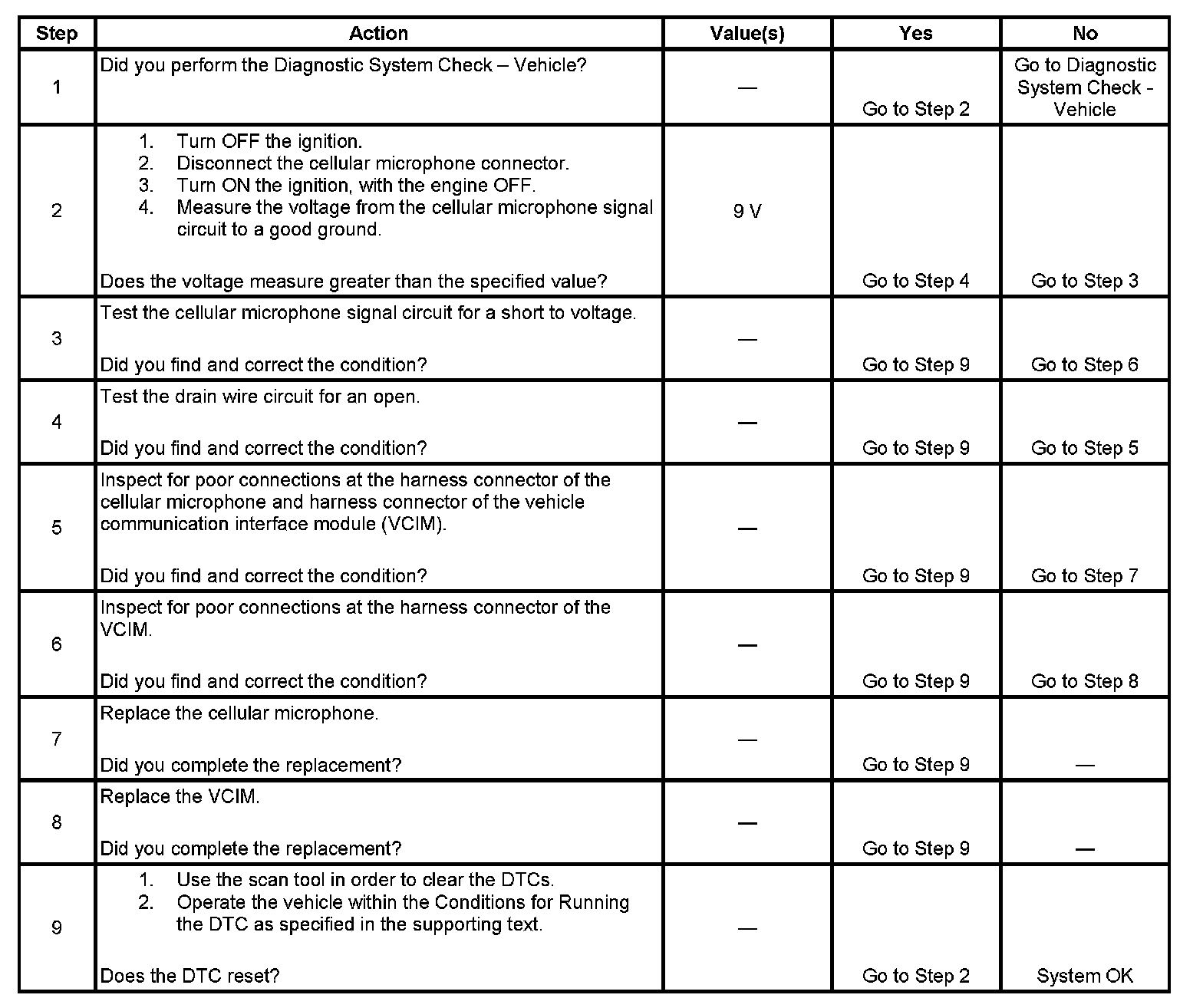 - The VCIM detects an open in the cellular microphone low reference circuit or a short to voltage in the cellular microphone signal circuit.