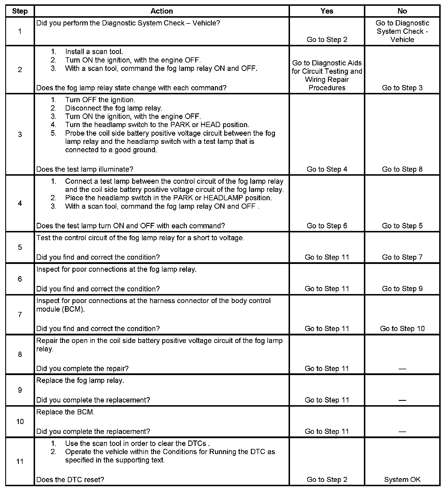 - The fog lamp relay control circuit is shorted to battery positive voltage for 250 milliseconds.