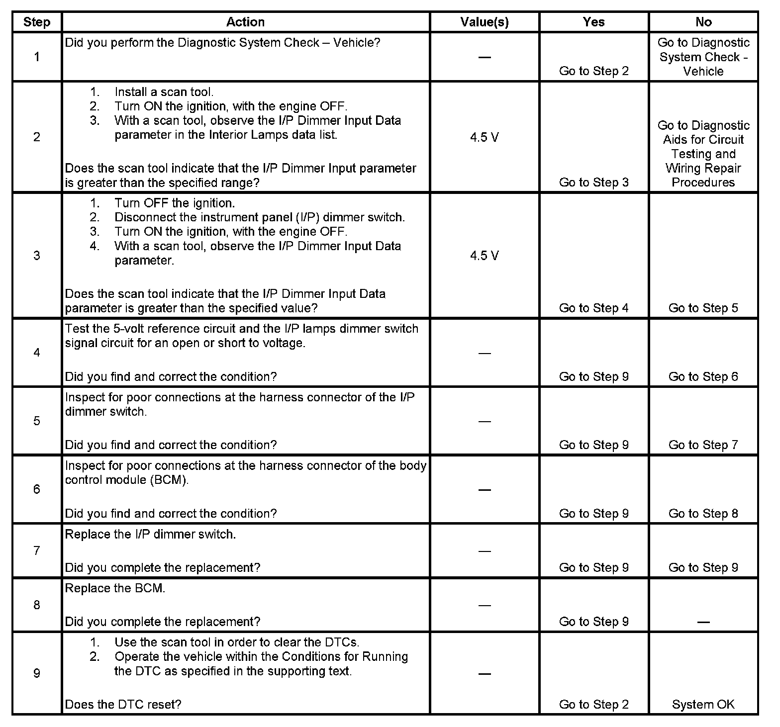 - The dimmer switch signal is open or shorted to voltage.