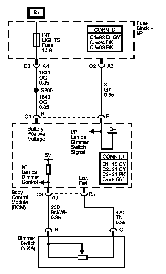 The body control module (BCM) receives a variable voltage from the instrument panel (I/P) lamp dimmer switch. The BCM uses this signal in order to vary the illumination level of the I/P lamps. The I/P dimming lamps output from the BCM is a pulse width modulated (PWM) voltage supply used to light the I/P lamps. If a malfunction occurs in the I/P dimming lamps output circuit, this DTC is set.