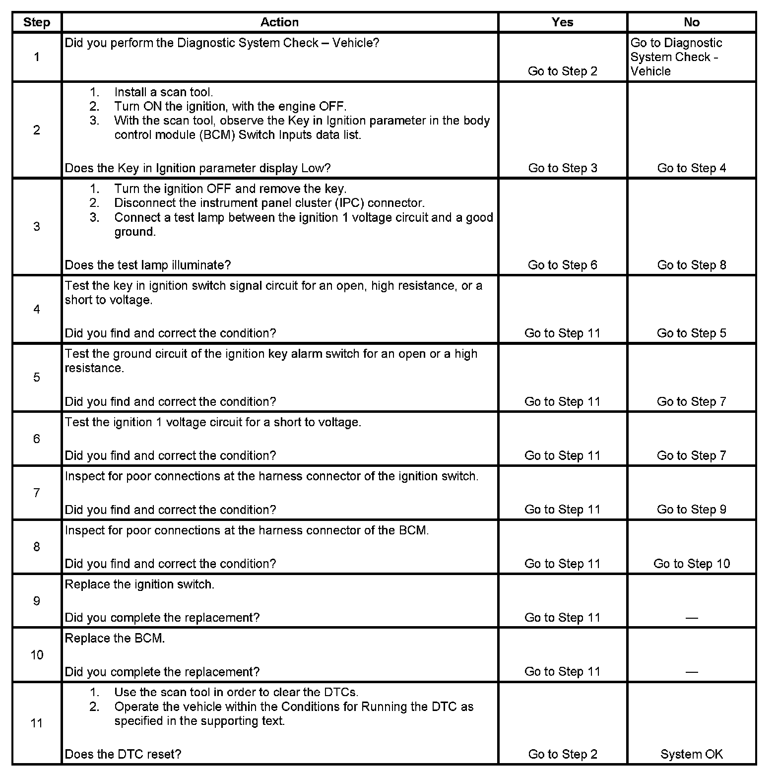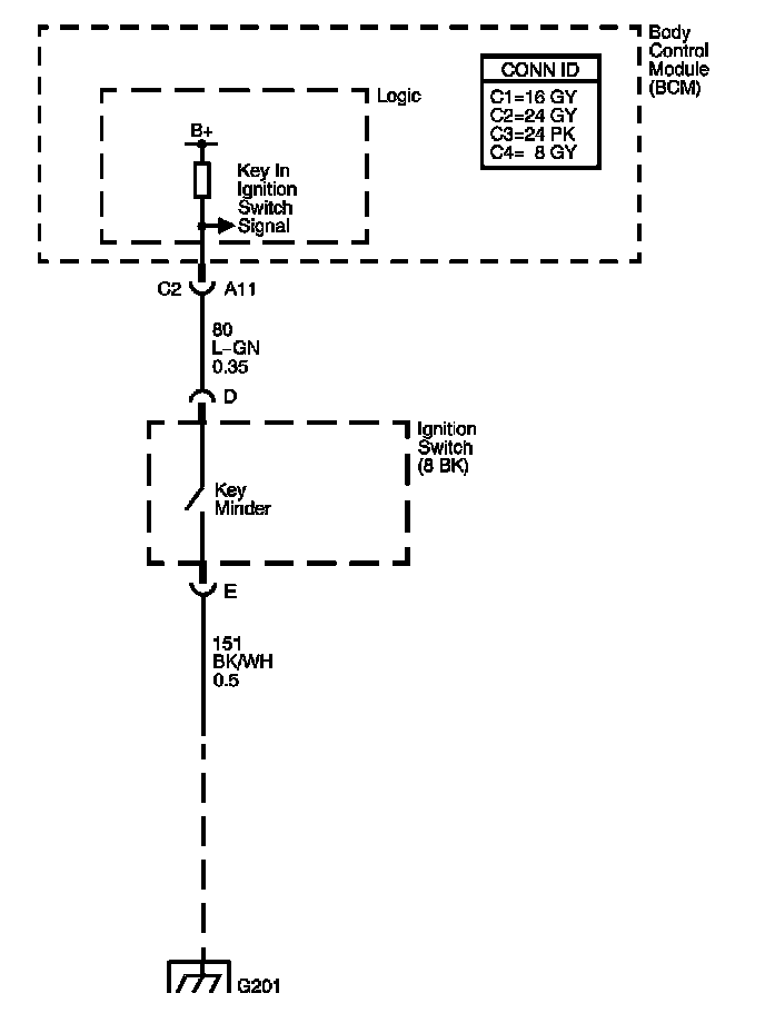 The ignition switch closes, the signal circuit is low, when the key is in the ignition, and opens, the signal circuit is high, when the key is not in the ignition. The body control module (BCM) monitors the key in ignition signal circuit in order to activate an audible warning.