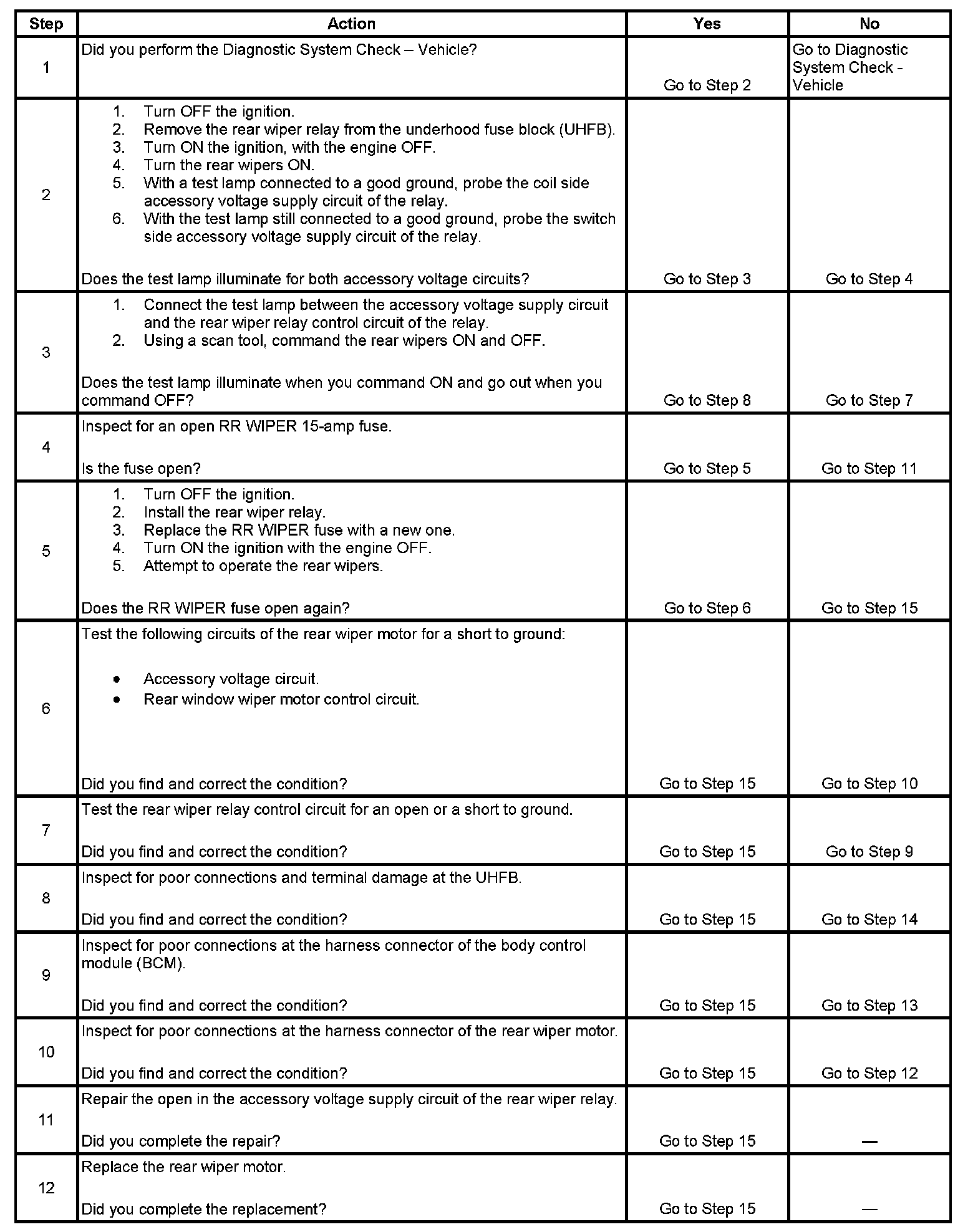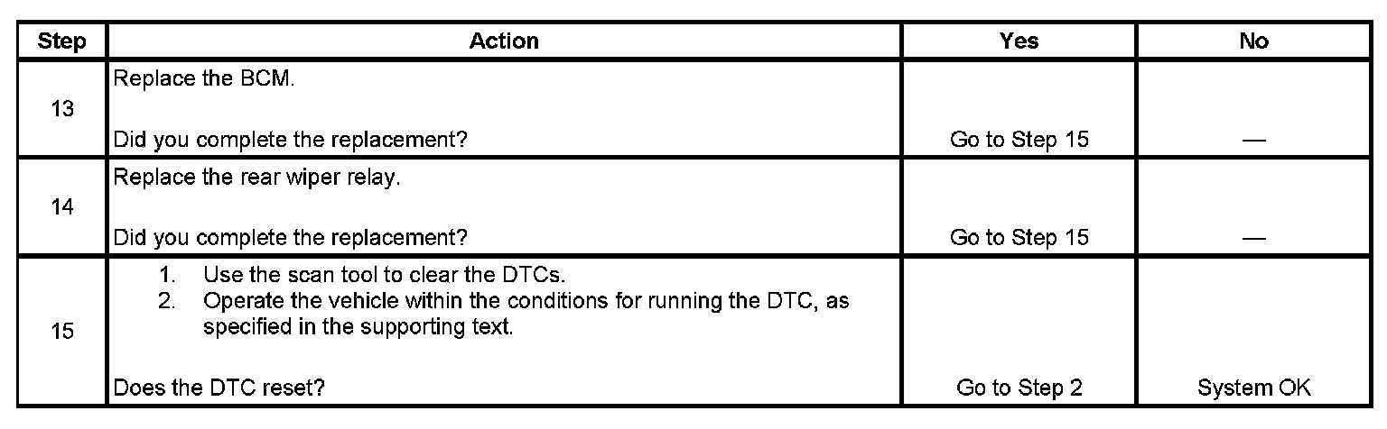 - The rear wiper relay control circuit is shorted to ground or open.
