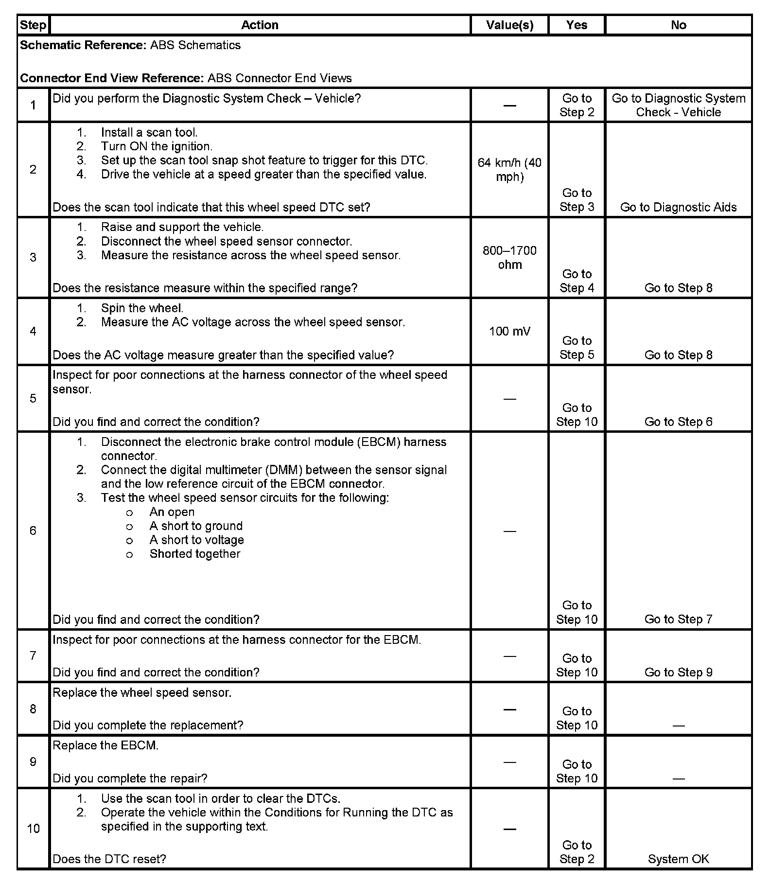 ^ The DTC will set if there is interference on the wheel speed circuits for 20 seconds with the brake pedal applied or 5 seconds when the brake pedal is not applied.