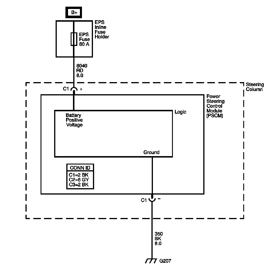 The power steering control module (PSCM) has a discrete battery positive voltage supply circuit. The PSCM monitors the voltage level on this circuit to ensure the electric power steering (EPS) system has adequate voltage levels to perform the system functions.