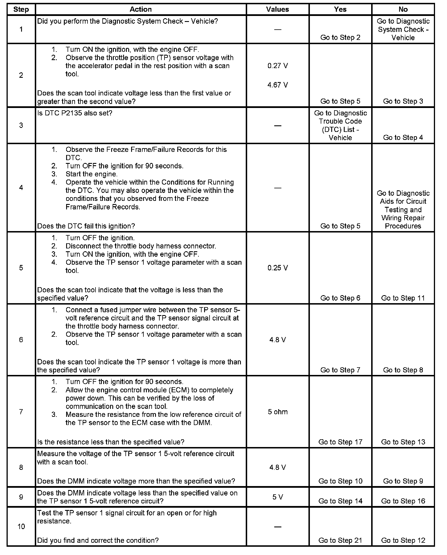 The TP sensor provides the engine control module (ECM) with a signal voltage proportional to the throttle plate movement. The TP sensor 1 signal voltage at closed throttle is near the 5-volt reference and decreases as the throttle plate is opened. The TP sensor 2 signal voltage at closed throttle is near the low reference and increases as the throttle plate is opened. When TP sensor 1 signal voltage is not within the predicted range, this DTC will set.