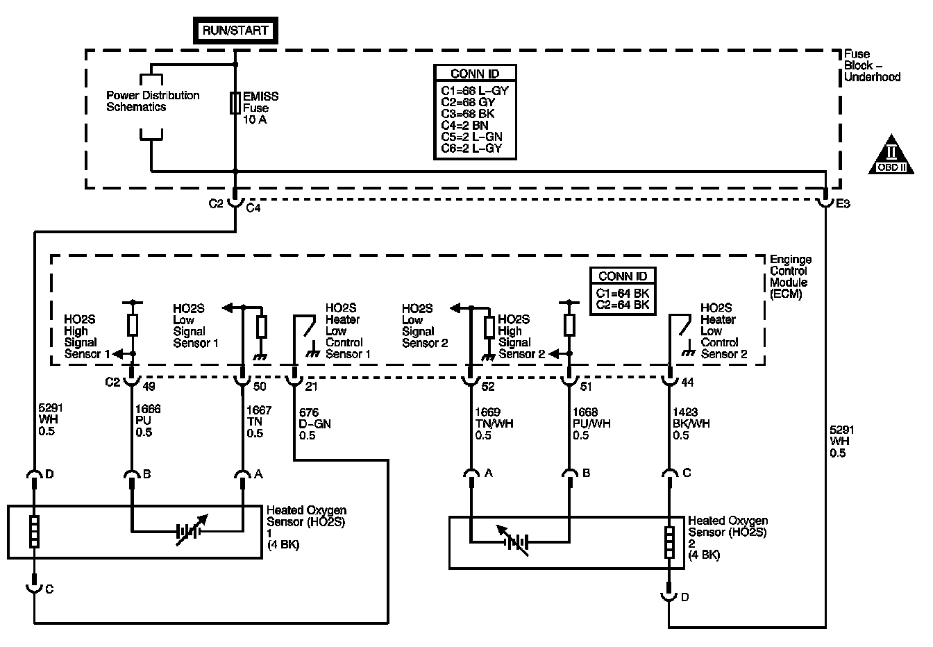 Heated oxygen sensors (HO2S) are used for fuel control and post catalyst monitoring. Each HO2S compares the oxygen content of the surrounding air with the oxygen content in the exhaust stream. The HO2S must reach operating temperature to provide an accurate voltage signal. A heating element inside the HO2S minimizes the time required for the sensor to reach operating temperature. Voltage is provided to the heater by the ignition 1 voltage circuit through a fuse. With the engine running, ground is provided to the heater by the HO2S heater low control circuit, though a low side driver within the engine control module (ECM). The ECM monitors the current flow through the heater for diagnosis.