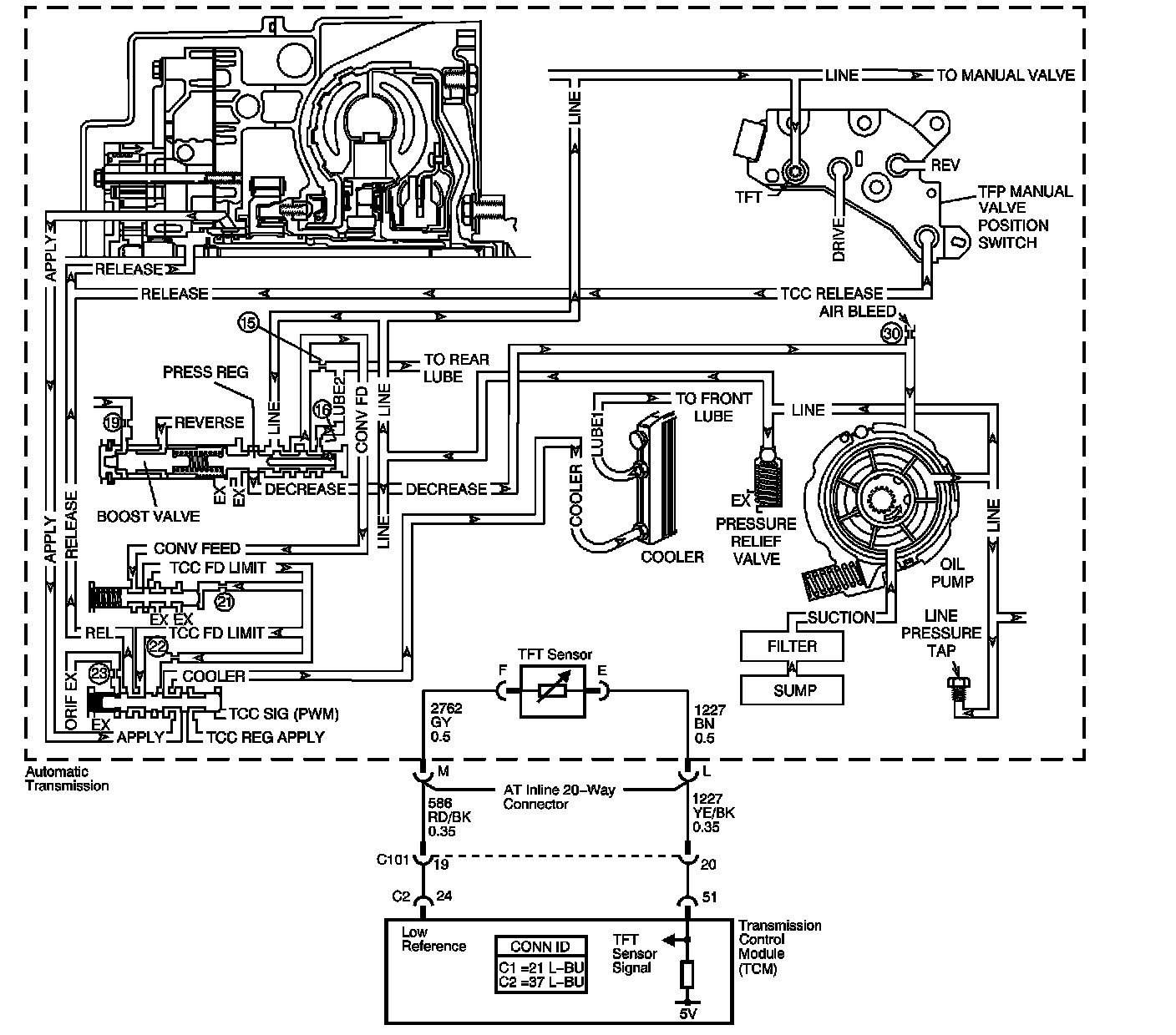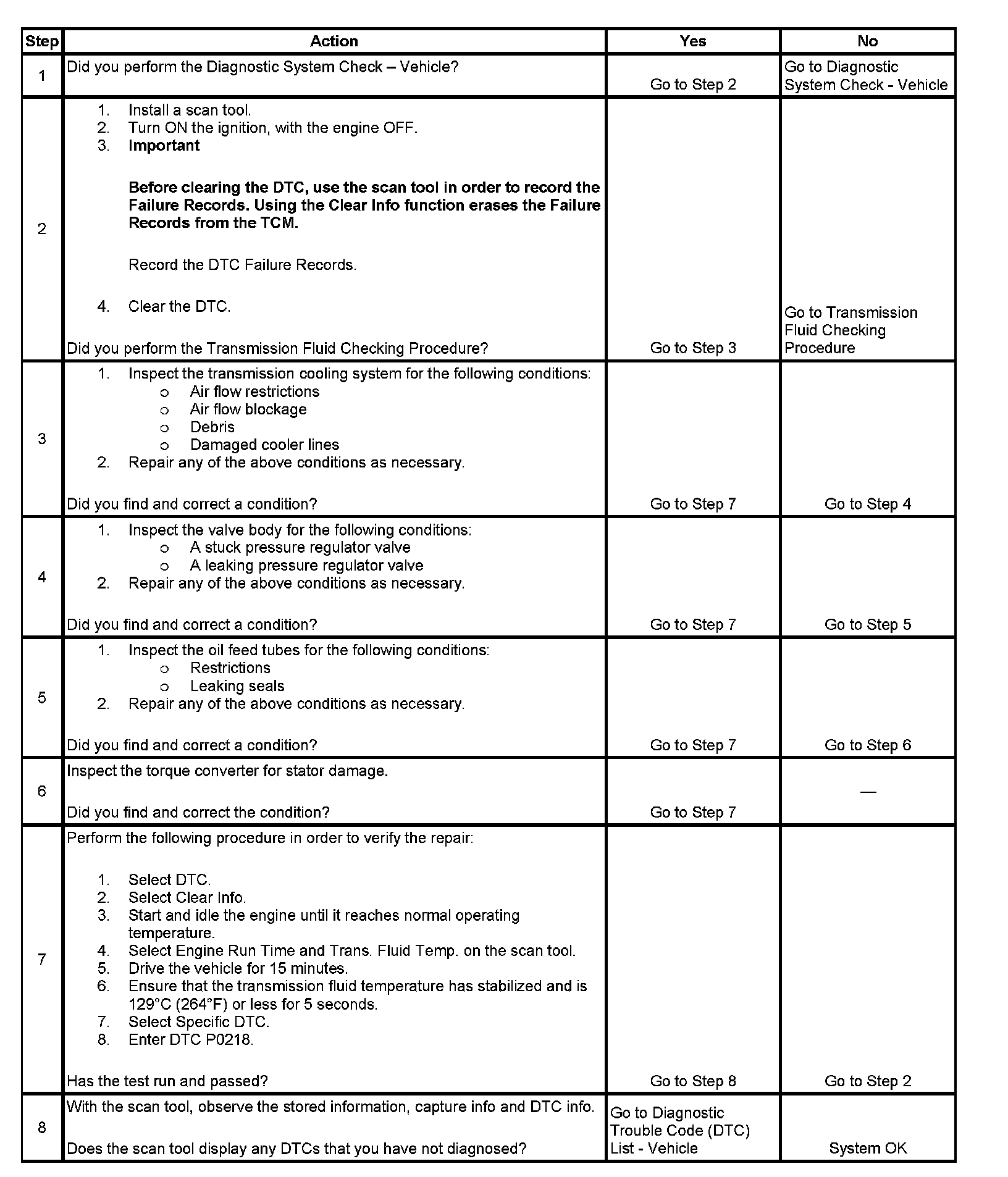 When the transmission control module (TCM) detects a high transmission fluid temperature (TFT) for a long period of time, DTC P0218 sets. DTC P0218 is a type C DTC.