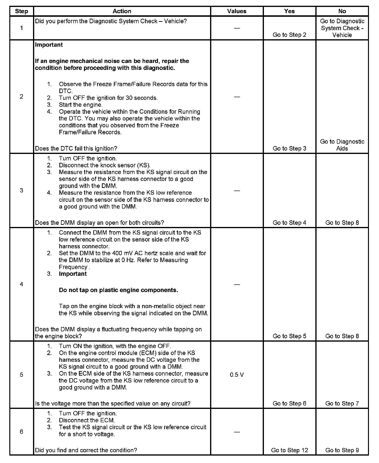 The Knock Sensor (KS) System enables the engine control module (ECM) to control the ignition timing for the best possible performance while protecting the engine from potentially damaging levels of detonation. The KS is located on the intake side of the engine block. The KS produces an AC voltage signal that varies depending on the vibration level during engine operation. The ECM adjusts the spark timing based on the amplitude and the frequency of the KS signal. The ECM receives the KS signal through a signal circuit. The KS ground is supplied by the ECM through a low reference circuit. The ECM learns a minimum KS noise level at idle and uses calibrated values for the rest of the RPM range. The ECM should monitor a normal KS signal within the noise channel. If the ECM detects the KS signal outside of the noise channel, or the KS signal is not present, this DTC sets.