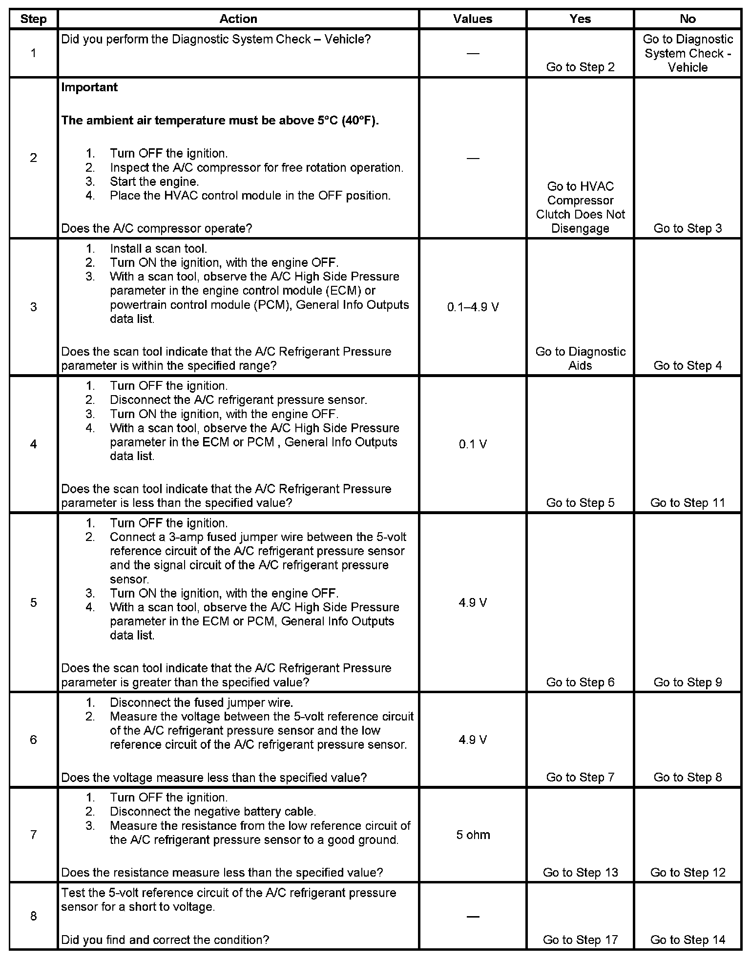 - The ECM/PCM is not receiving an A/C request from the BCM over serial data with A/C refrigerant pressure sensor voltage greater than 4 volts (358 psi).