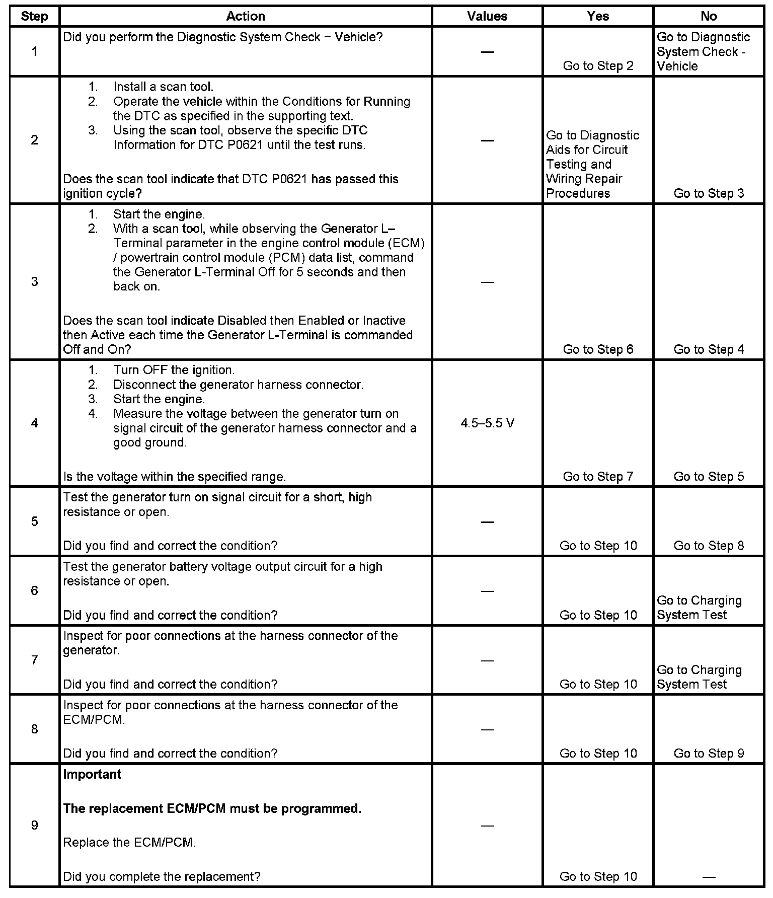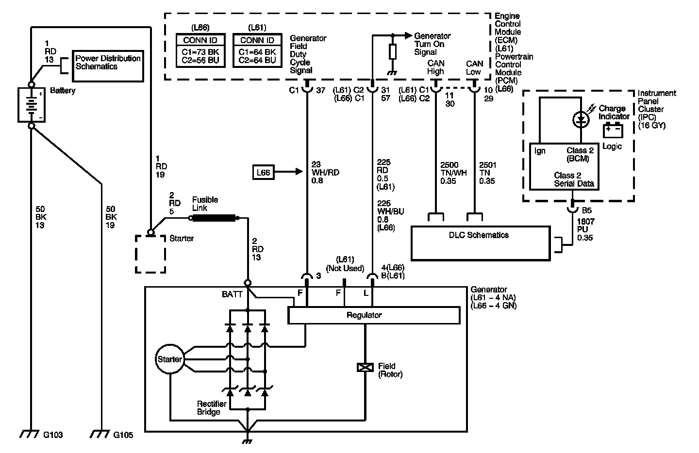 The ECM/PCM monitors the state of the generator turn on signal circuit. With the engine running, the ECM/PCM should detect a high generator turn on signal circuit, or when the charging system malfunctions. If the ECM/PCM detects a low generator turn on signal circuit DTC P0621 will set. When the DTC sets, the ECM/PCM will send a class 2 serial data message to the instrument panel cluster (IPC) to illuminate the charge indicator.