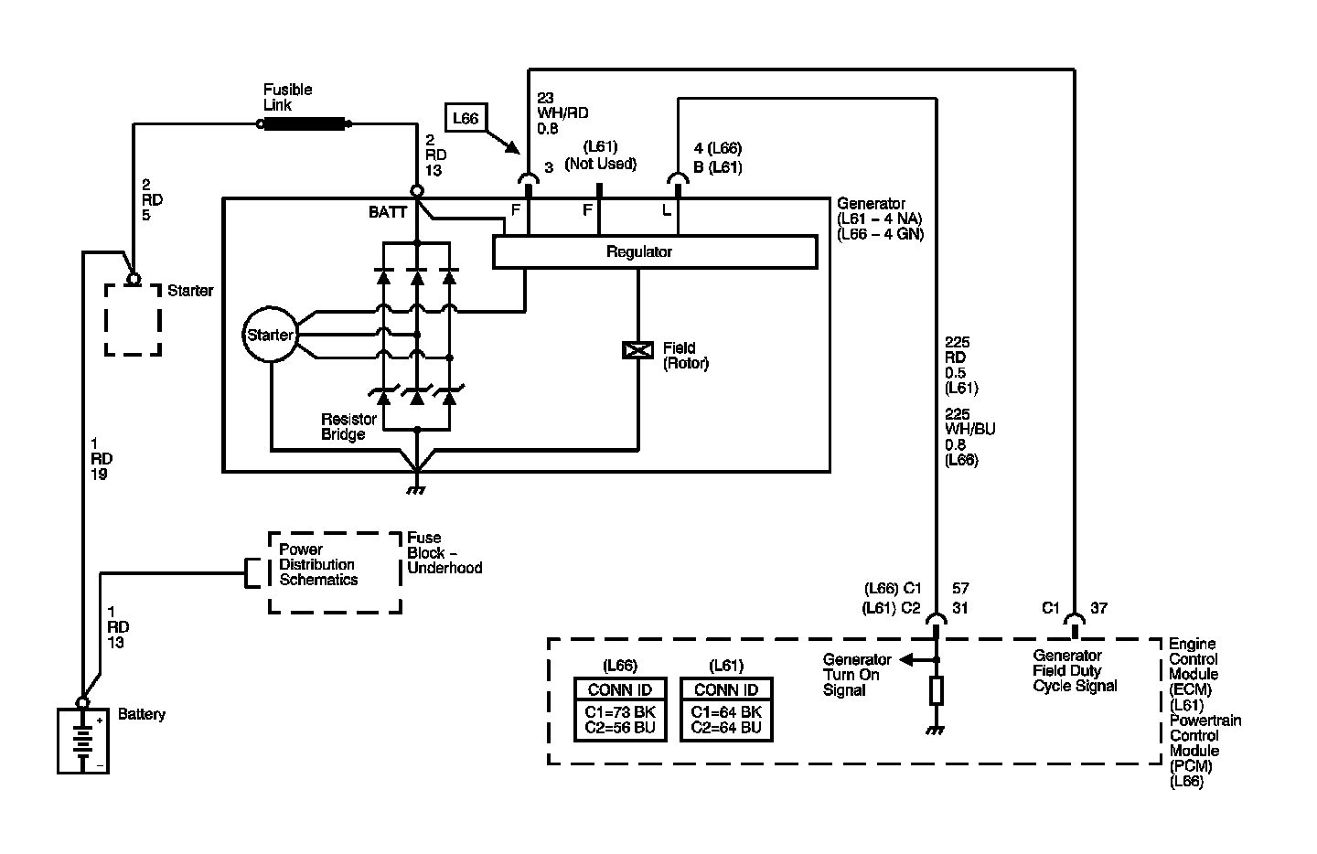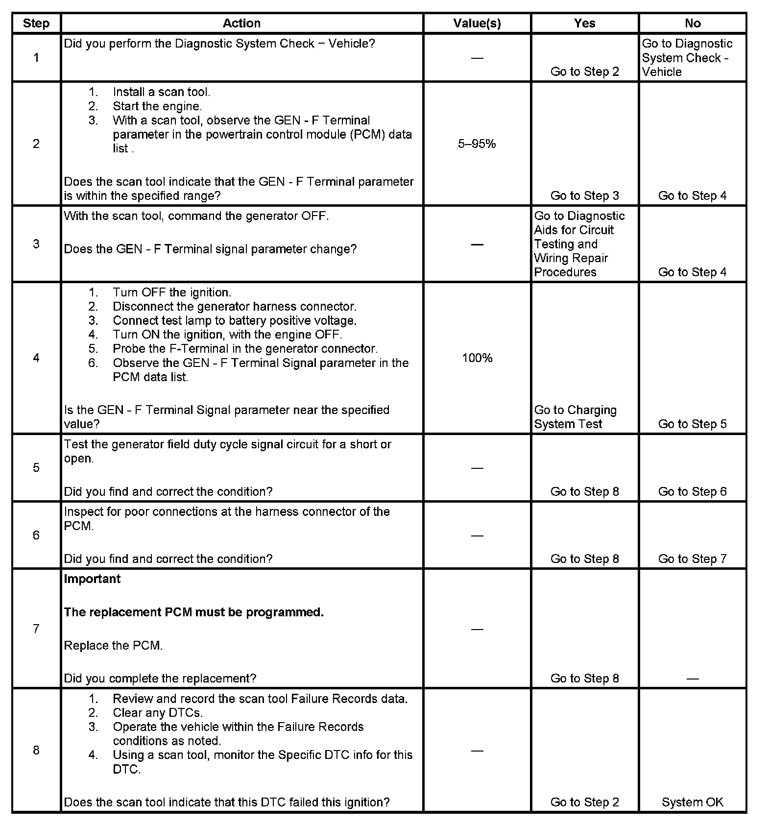 The powertrain control module (PCM) uses the generator field duty cycle signal circuit to monitor the duty cycle of the generator. The generator field duty cycle signal circuit connects to the high side of the field winding in the generator. A pulse width modulated (PWM) high side driver in the voltage regulator turns the field winding ON and OFF. The PCM uses the PWM signal input to determine the generator load on the engine. This allows the PCM to adjust the idle speed to compensate for high electrical loads.