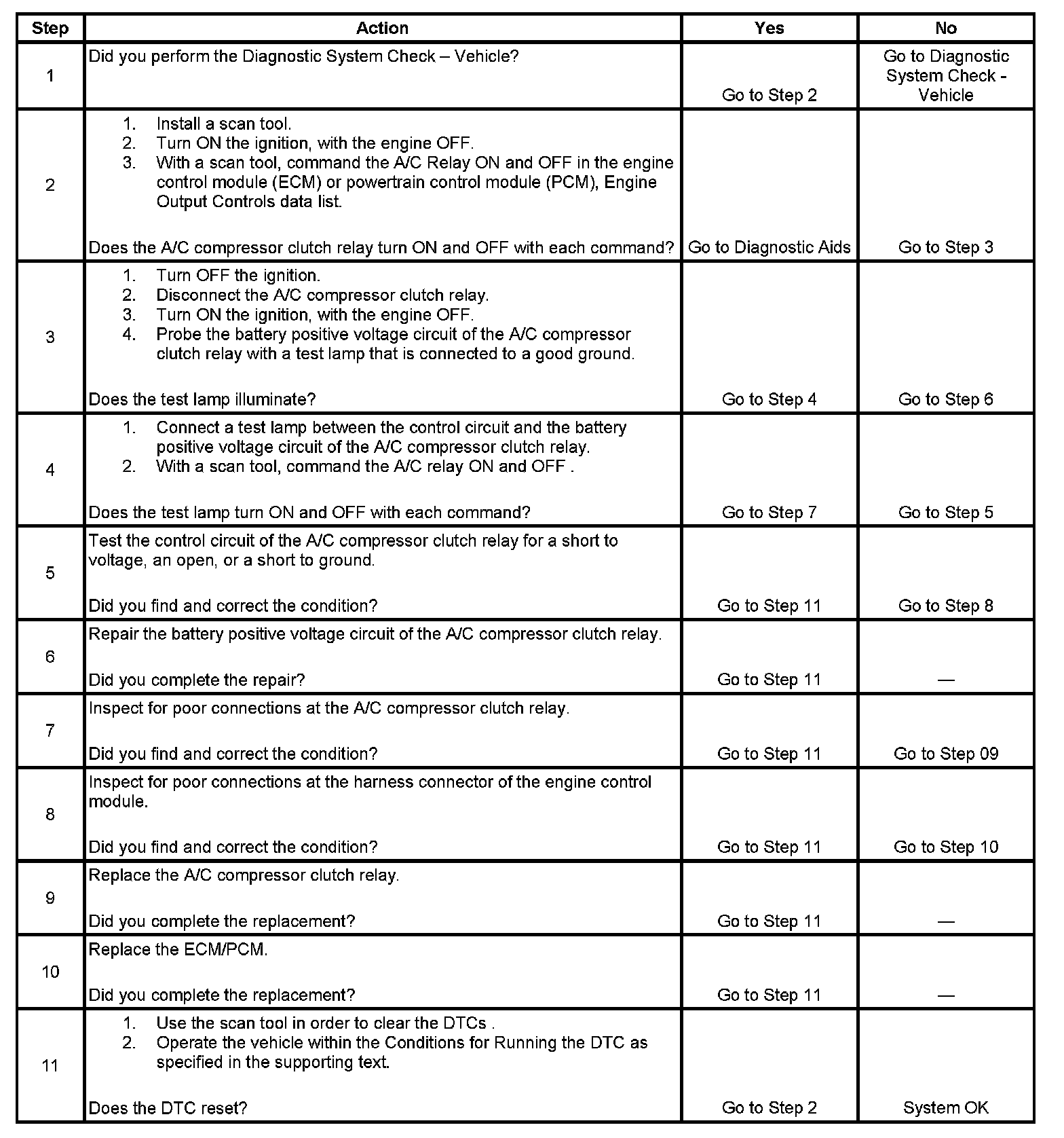 Ignition voltage is supplied directly to the A/C compressor clutch relay. The engine control module (ECM) or powertrain control module (PCM) controls the relay by grounding the A/C clutch relay control circuit via an internal solid state device called a driver. The primary function of the driver is to supply the ground for the component being controlled. The driver has a fault line which is monitored by the ECM/PCM. When the ECM/PCM is commanding a component ON, the voltage of the control circuit should be near 0 volts. When the ECM/PCM is commanding the control circuit to a component OFF, the voltage potential of the circuit should be near battery voltage. If the fault detection circuit senses a voltage other than what is expected, a DTC will set.