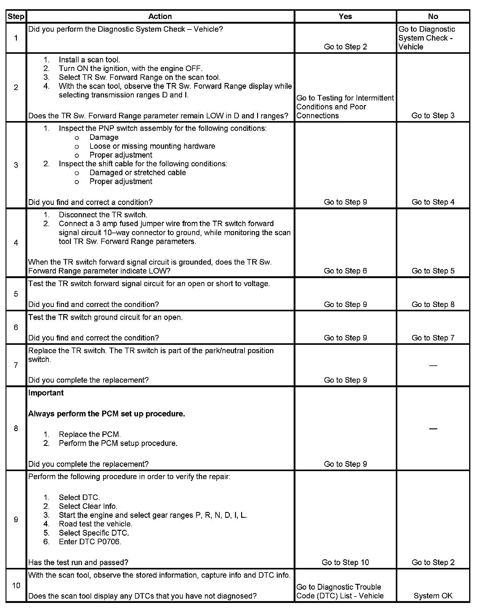 When the PCM detects that the TR forward signal is open or shorted to voltage while driving, with the transmission range selector in the D or 1 position, DTC P0706 sets. DTC P0706 is a type B DTC. Refer to Range Reference.