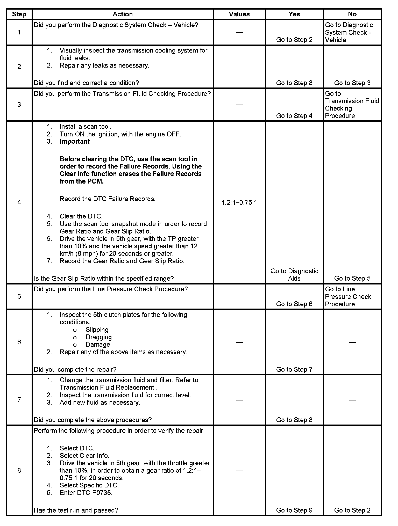 When the calculated ratio is incorrect for 5th gear, while the PCM is commanding 5th gear, DTC P0735 sets. DTC P0735 is a type C DTC.