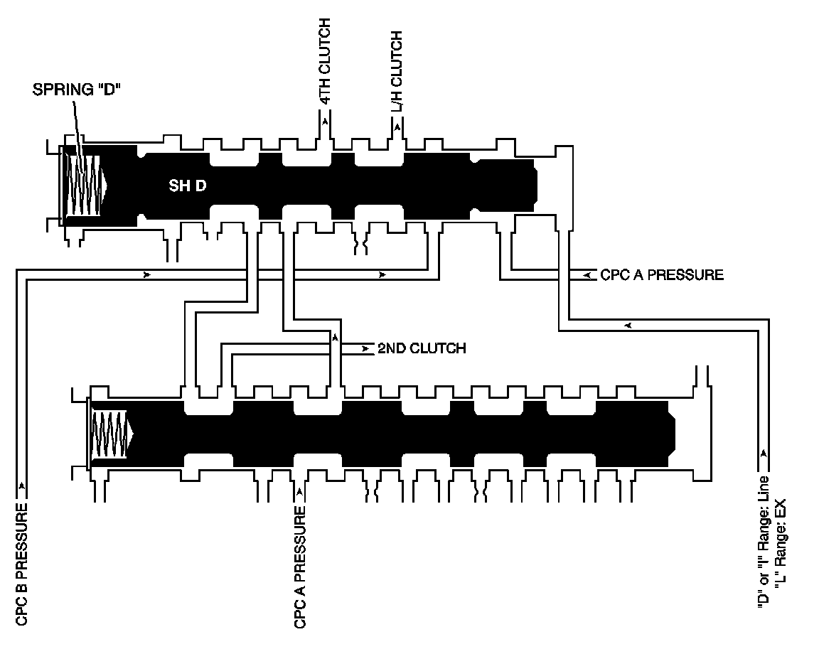Shift valve D is incorporated into the control circuit inside the transmission. When the shift lever is in D or I range, line pressure is supplied to shift valve D, and clutch control pressure A is supplied to the 4th clutch. When the shift lever is in L range, the shift valve D is pushed by the spring D and the clutch control pressure B is supplied to the L/H clutch. Shift valve D operates upon rise in the line pressure or clutch control pressure A. Shift valve D is pushed back by the reactive force of spring D when the line pressure or clutch control pressure A drops. The PCM monitors mainshaft to output shaft speed ratio in the gear positions determined by the shift schedule.