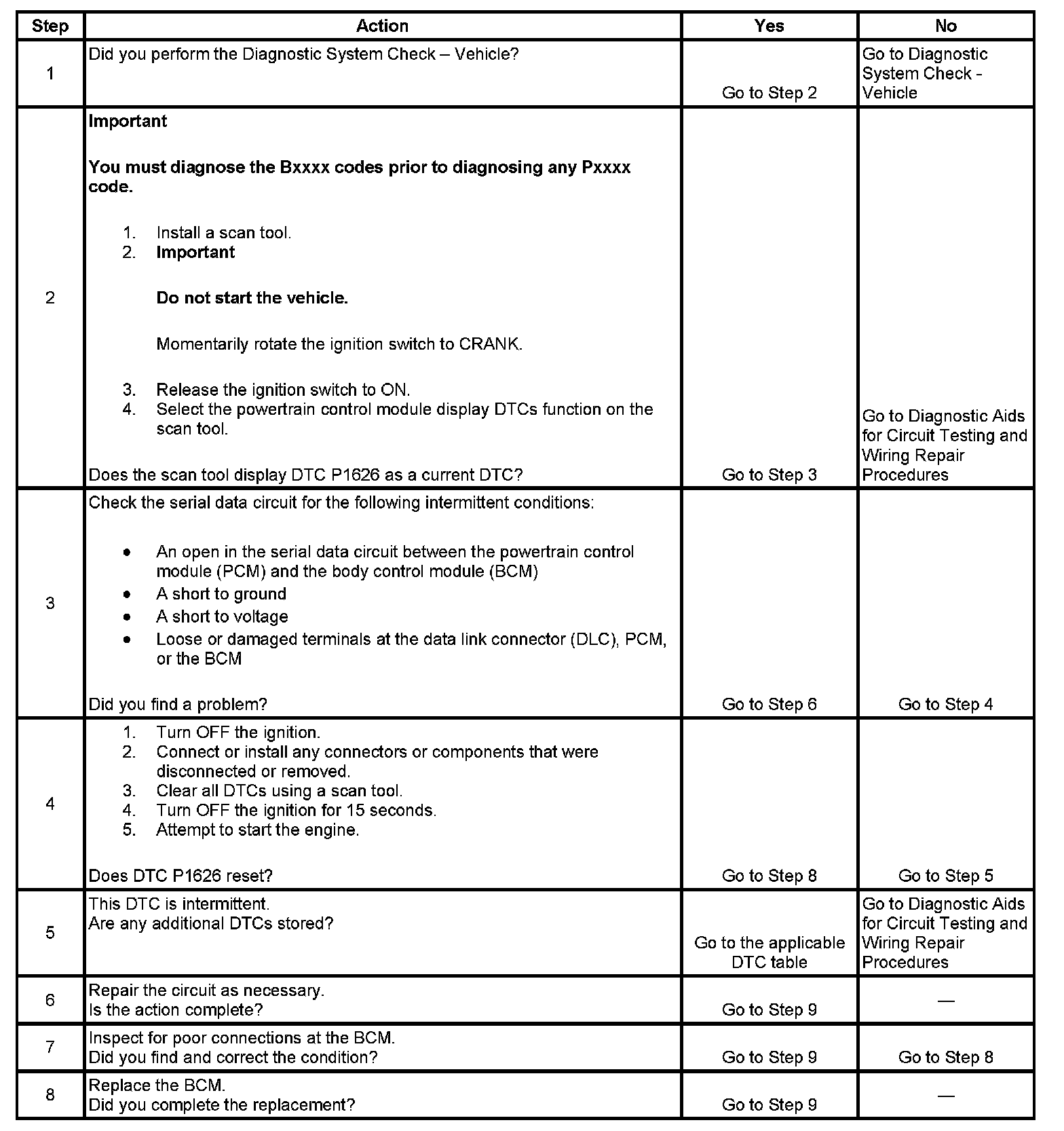 - If the serial data circuit is shorted to ground or shorted to voltage, then all systems connected to the serial data circuit will not be able to communicate properly. Systems capable of storing loss of communications DTCs, or the DTCs with the letter "U" as a prefix, will have these codes stored in their memory. If a DTC U1192 is stored in the PCM memory along with the P1626, then a fault occurred at some point after the PCM received the correct password. The BCM must also be checked for intermittent operation due to a loss of power or ground to the module itself. After repairing the cause of DTC P1626, clear all DTCs from the systems capable of storing this DTC and DTC U1192.
