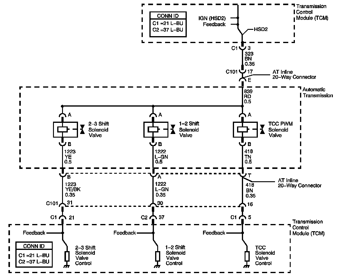 The transmission control module (TCM) provides voltage to the pressure control solenoid, the shift solenoids, and the torque converter clutch pulse width modulated (TCC PWM) solenoid through 2 separate solid-state devices called high side drivers (HSD) - HSD1 and HSD2. HSD1 provides electrical power to the pressure control solenoid. HSD2 provides power to the shift solenoids and the TCC PWM solenoid. A normal function of the TCM is to run tests on each driver to ensure that it is functioning properly.