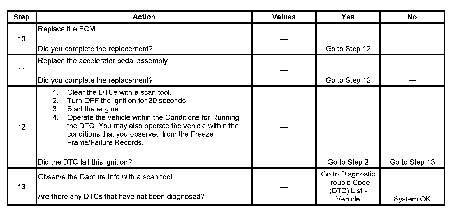 This provides the engine control module (ECM) with a signal voltage proportional to accelerator pedal movement. The APP sensor 1 signal voltage at rest position is near the low reference and increases as the pedal is actuated. The APP sensor 2 signal voltage at rest position is also near the low reference and increases as the pedal is actuated. If the ECM detects the APP sensor 1 signal voltage is not within the predicted range, DTC P2122 sets.
