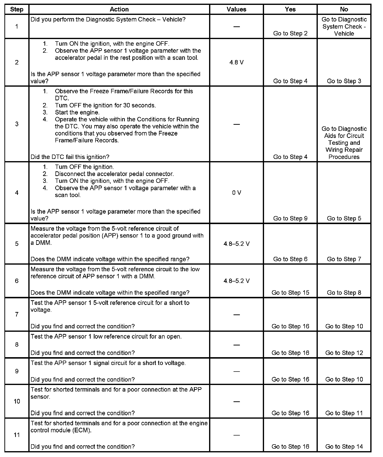 This provides the engine control module (ECM) with a signal voltage proportional to accelerator pedal movement. The APP sensor 1 signal voltage at rest position is near the low reference and increases as the pedal is actuated. The APP sensor 2 signal voltage at rest position is also near the low reference and increases as the pedal is actuated. If the ECM detects the APP sensor 1 signal voltage is not within the predicted range, DTC P2123 sets.