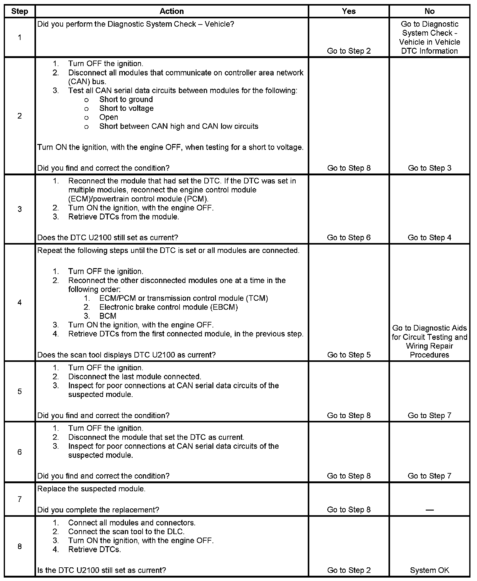 Modules connected to the controller area network (CAN) serial data circuits monitor for serial data communications during normal vehicle operation. Operating information and commands are exchanged among the modules. If no communication is detected on CAN serial data circuit, the DTC is set. A total non communication condition may be caused by a short to battery or voltage on any of the CAN circuits or a short between the CAN high and low circuits.