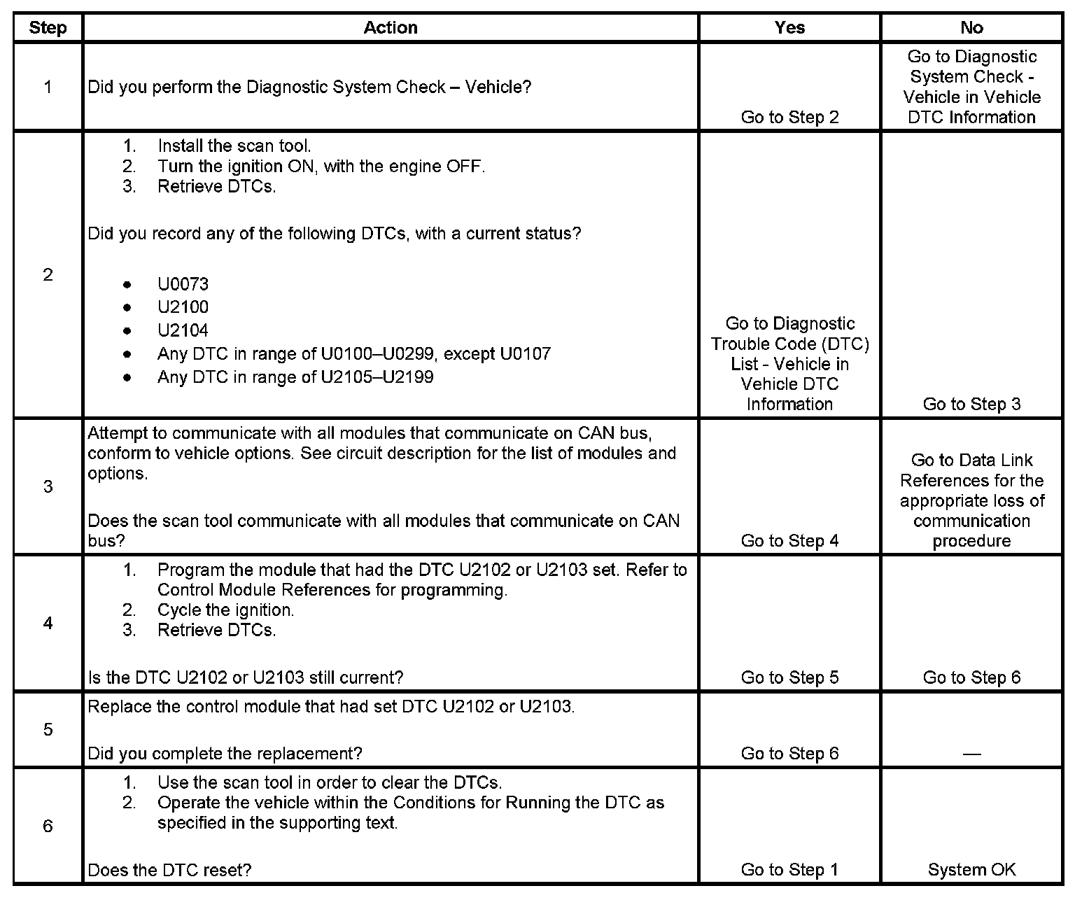 Modules connected to the controller area network (CAN) serial data circuits monitor for serial data communications during normal vehicle operation. Operating information and commands are exchanged among the modules. If no communication is detected on CAN serial data circuit, the DTC is set. A total non communication condition may be caused by a short to battery or voltage on any of the CAN circuits or a short between the CAN high and low circuits.