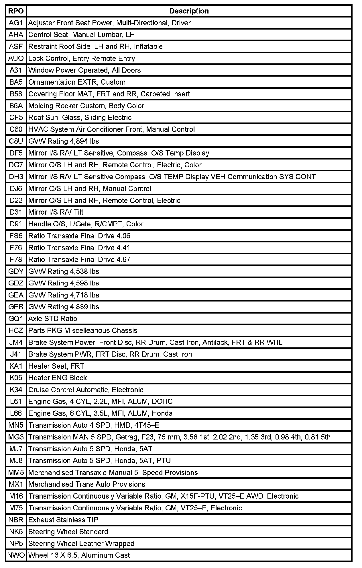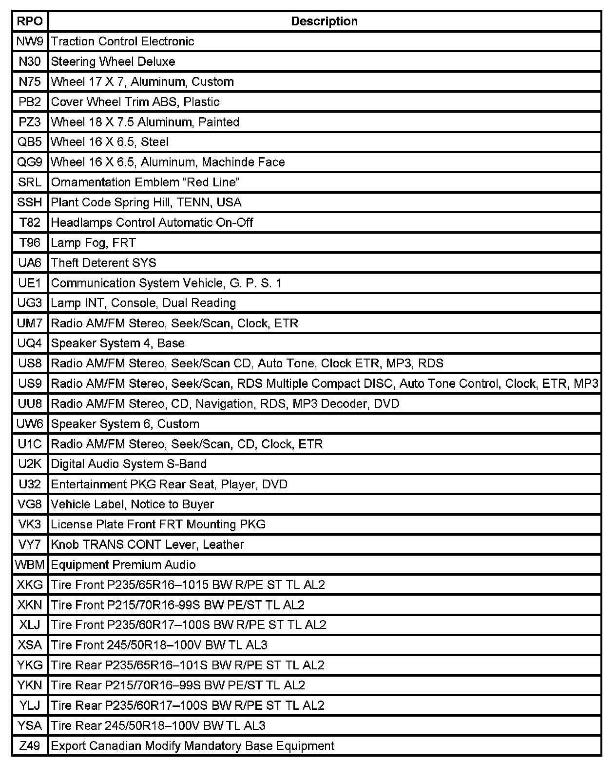 The table provides the description of the RPO codes that are available on the vehicle. The vehicle's RPO list is printed on the Service Parts Identification Label.