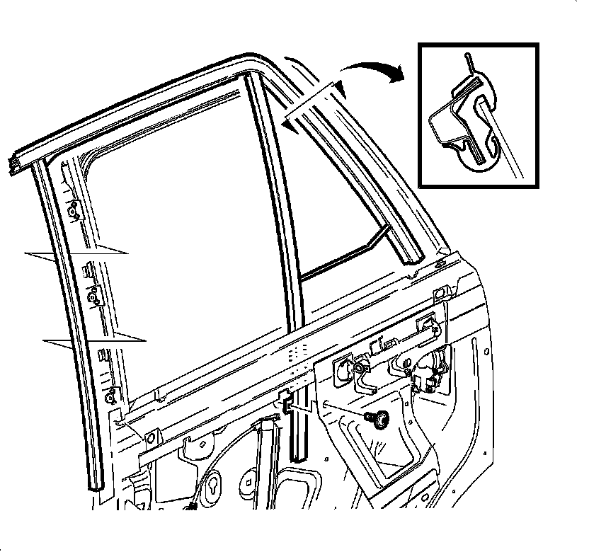 3. Remove the rear door window weatherstrip run channel assembly. Refer to Window Weatherstrip Run Channel Assembly Replacement - Rear (Window Weatherstrip Run Channel Assembly Replacement - Rear).