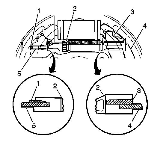 6. Remove the brake shoe hold-down springs and retainers (4) from the brake shoes.