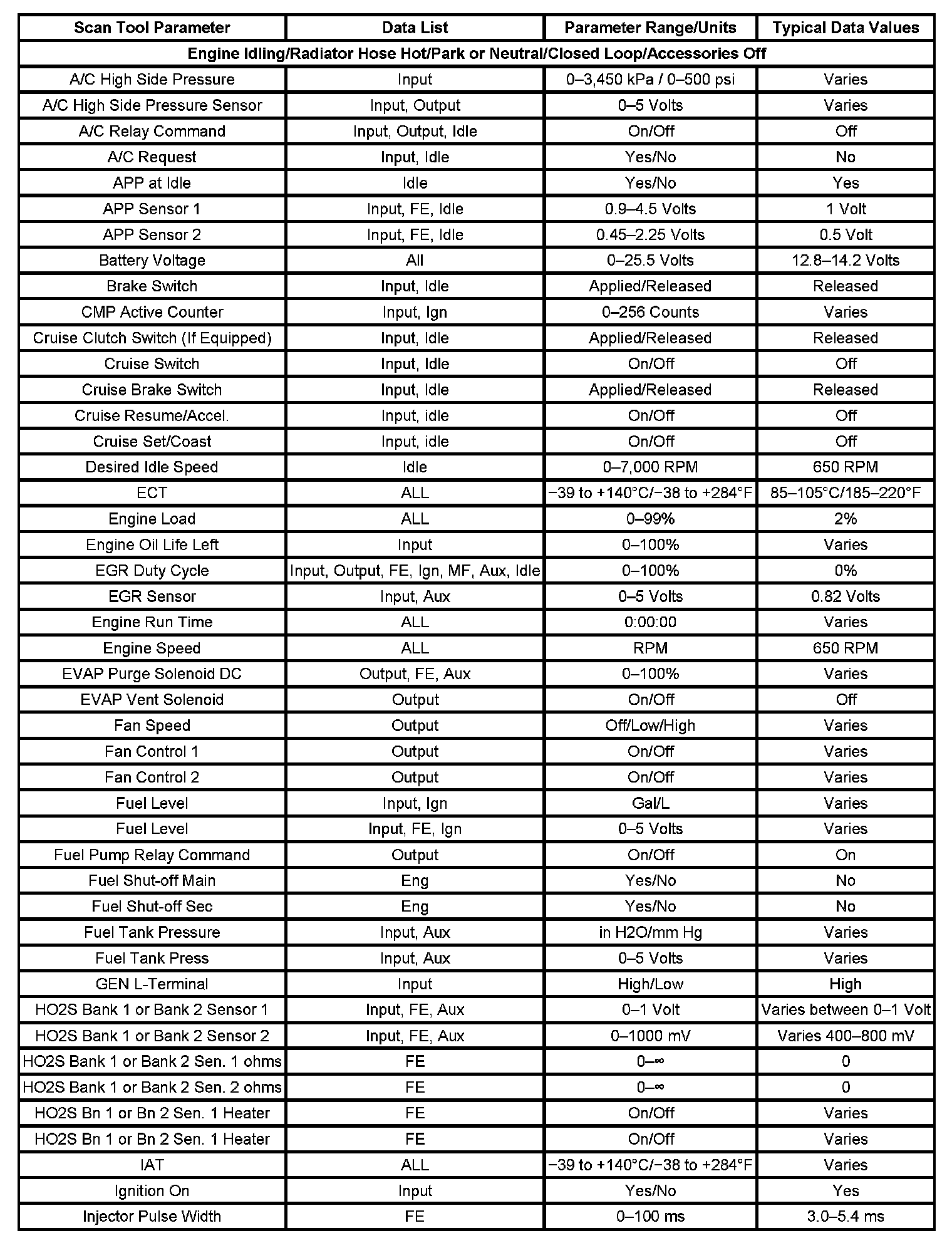 The Engine Scan Tool Data List contains all engine related parameters that are available on the scan tool. The list is arranged in alphabetical order. A parameter may appear in any one of the data lists, and in some cases may appear more than once, or in more than one data list in order to group certain related parameters together.