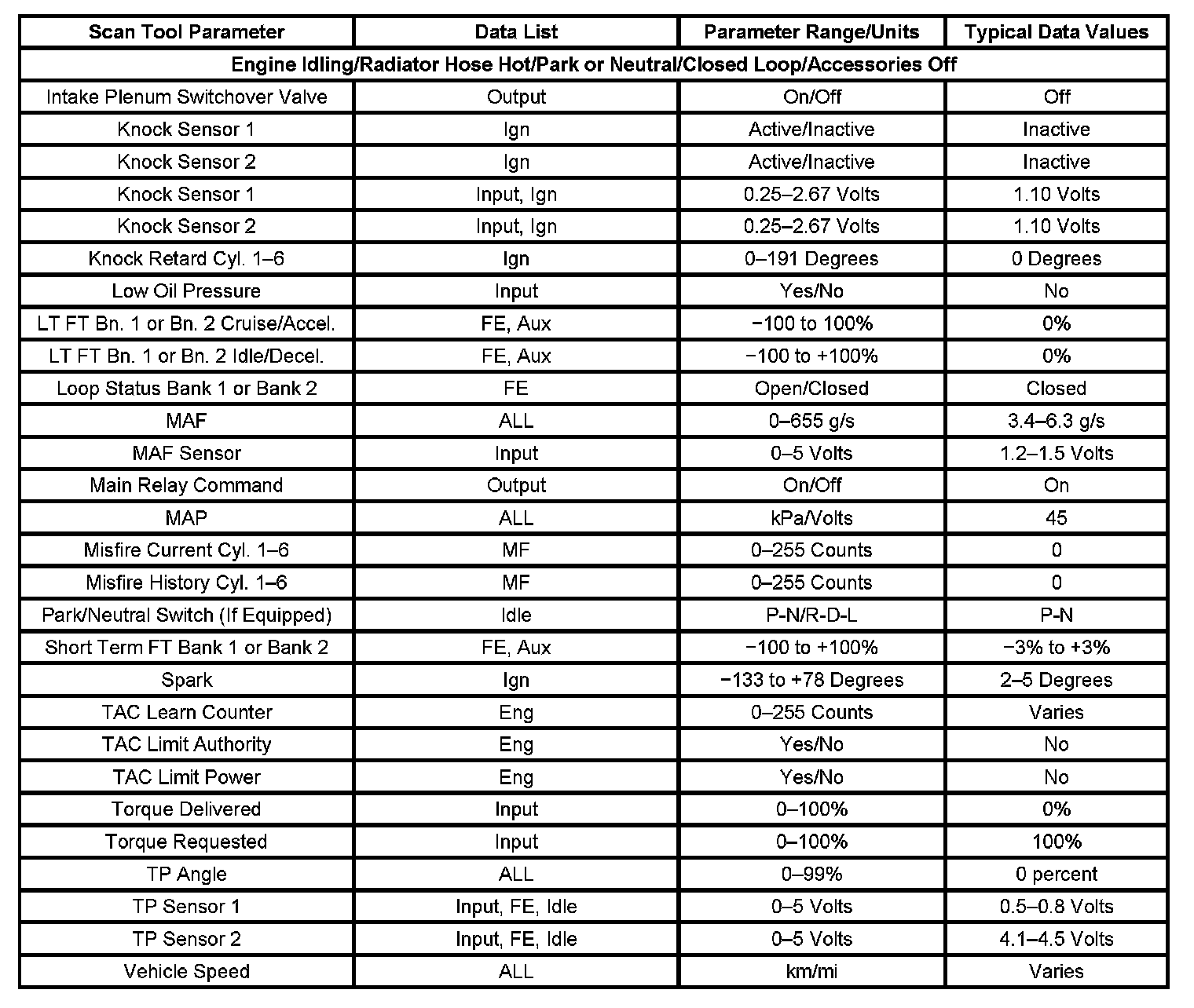 Scan tool values from a properly running engine may be used for comparison with the engine you are diagnosing. The Engine Scan Tool Data List represents the values that would be seen on a normal running engine.