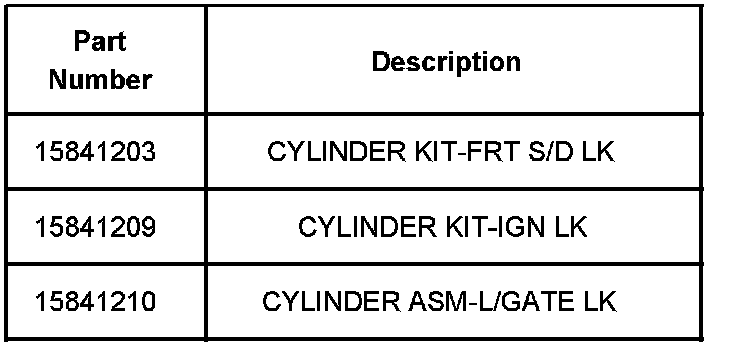 The purpose of this bulletin is to inform Saturn Retailers of a change to service parts availability for Saturn VUE lock cylinder components. The current lock cylinder kits for the doors, rear compartment and ignition cylinder will be modified to now include additional component parts to build up a complete ignition, door, or rear compartment lock cylinder assembly. Additionally, once inventory of the lock cylinder individual component parts (i.e. tumblers, springs, levers, shutter, cap, etc.) are depleted, these component parts will only be available as part of the new lock cylinder kits, P/Ns 15841203, 15841209, and 15841210.