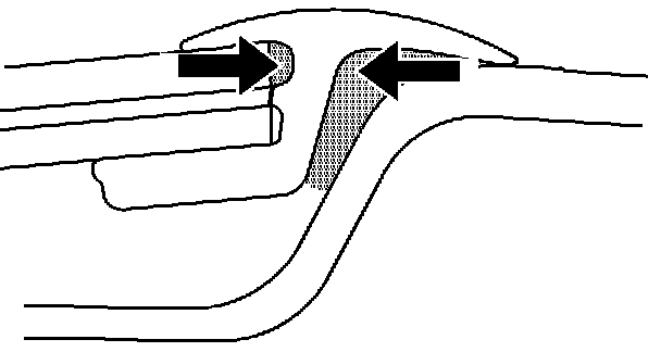 8. Install the new windshield upper reveal molding onto the windshield on one end, and then move across the windshield engaging from this starting point to the other side of windshield. Make sure the channel is fully seated against the windshield and the roof panel. Inspect for and clean any excess urethane adhesive on the windshield or the roof panel.