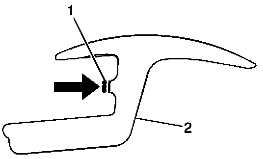 7. Place a 1-2 mm (0.04-0.08 in) bead of urethane adhesive (1) on the new windshield upper reveal molding (2), in the windshield channel, as shown. Ensure that the urethane adhesive is applied consistently on the molding.