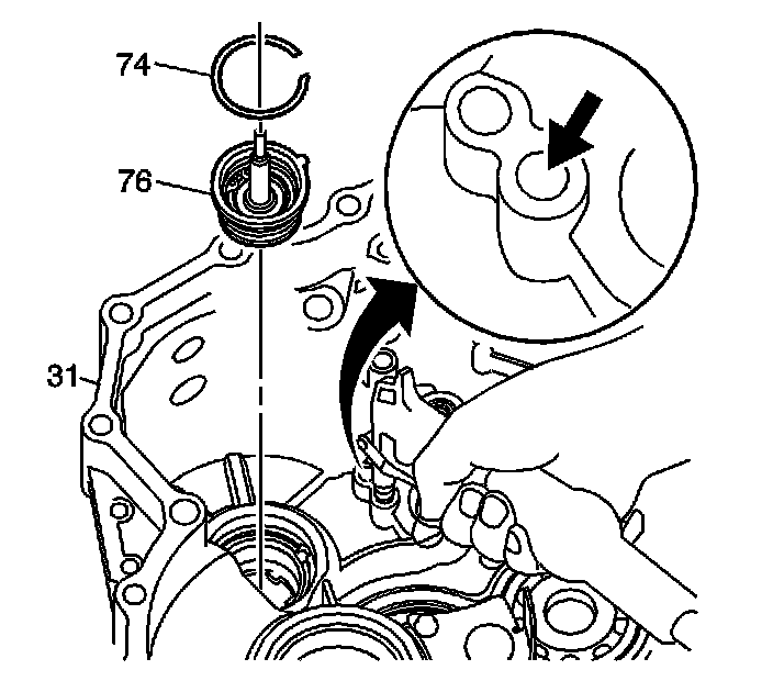2. Install the 1st/coast clutch apply fluid collar assembly (76) into the transmission case bore (31), aligning the fluid collar tab to the transmission case.