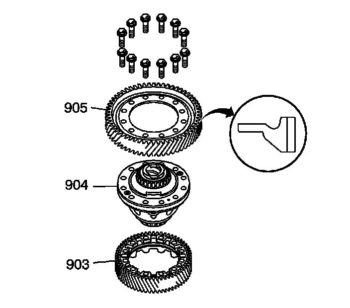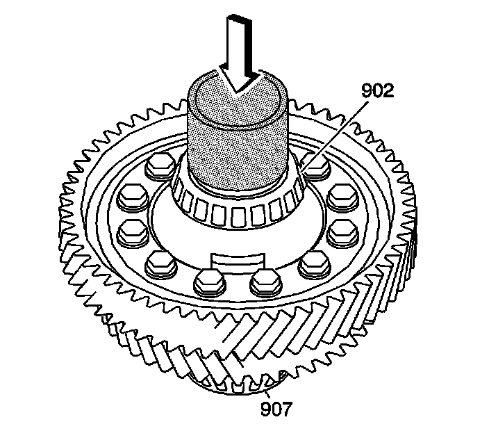3. Install the driven ring gear (905) on the front differential assembly (904).