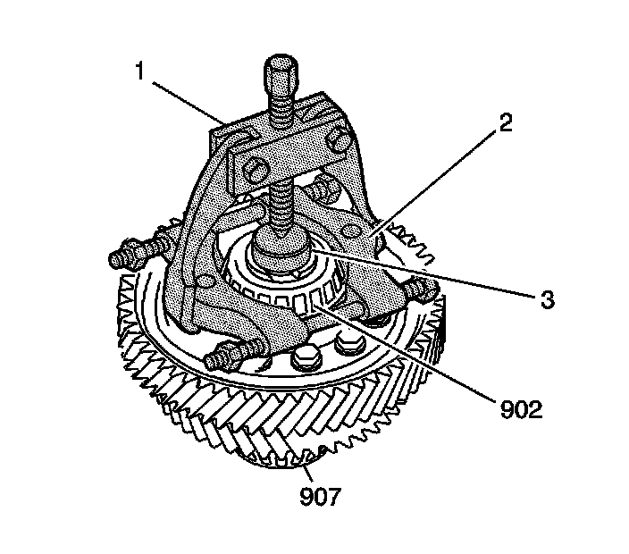 1. Using SA9211T-2 (1), J 22912-01 (2), and a shaft protector (3), remove the front differential tapered front roller bearing (902).