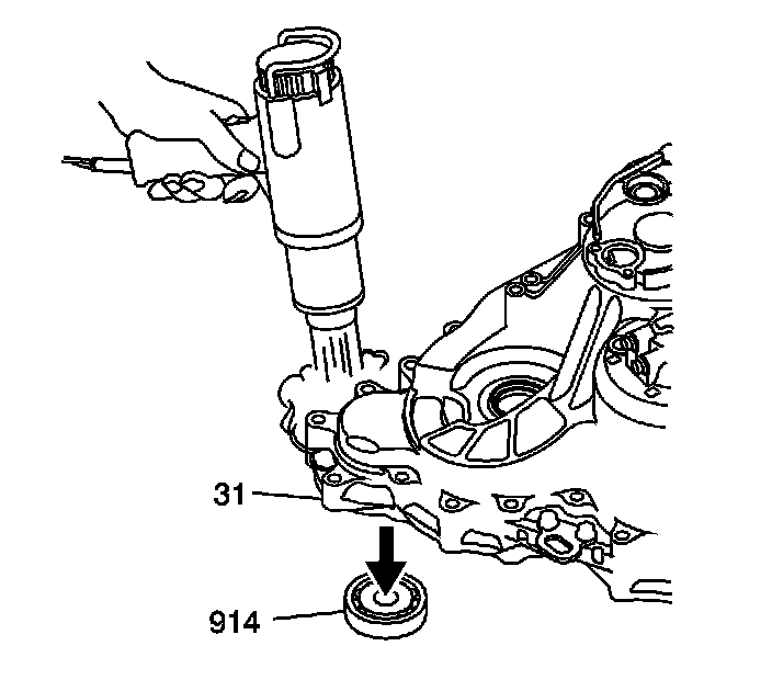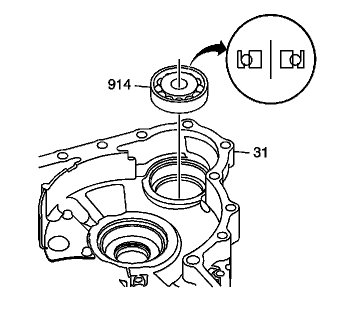 1. Install the transfer case input gear 40 x 80 x 16.5 mm bearing (914) into the transmission case (31) in the direction shown in the insert.