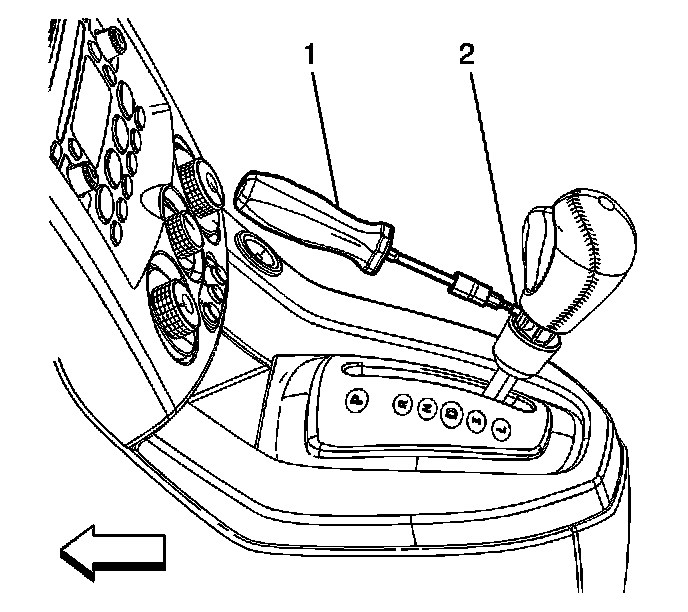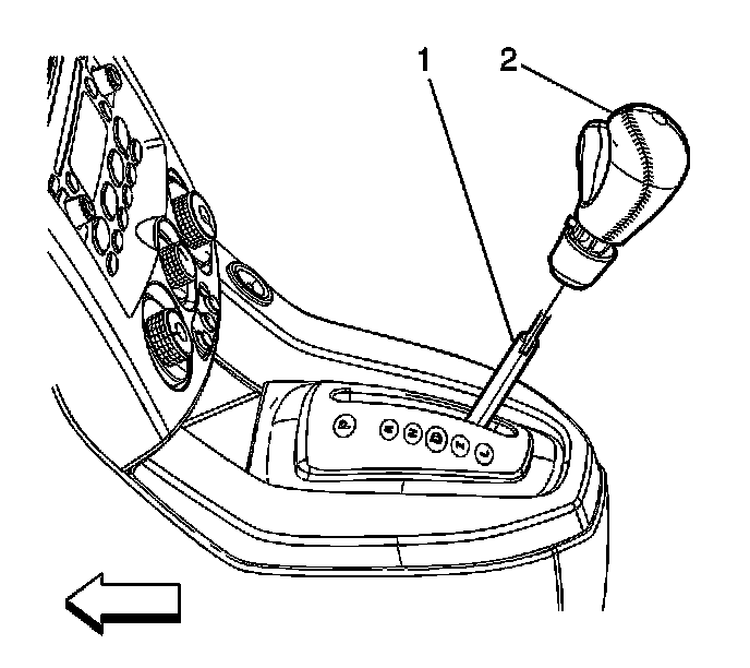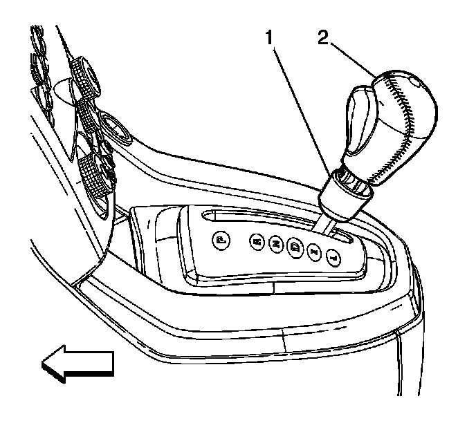 2. Apply careful downward pressure to the shift knob trim ring (3) to separate the trim ring trim the shift knob. The trim ring (3) will drop down approximately 13.0 mm (0.5 inch) exposing the shift knob retaining screw.