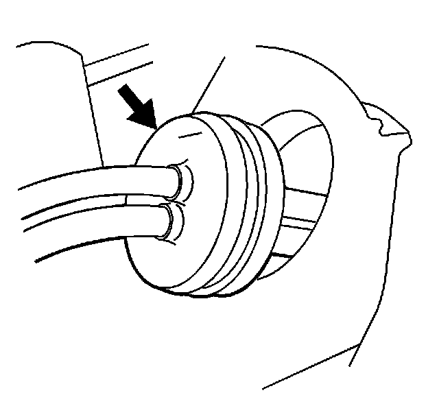 1. Install the shift cables from the interior of the vehicle to the underhood area. Ensure that the shift cable pass-through grommet is properly seated and the grommet arrow is pointing up.
