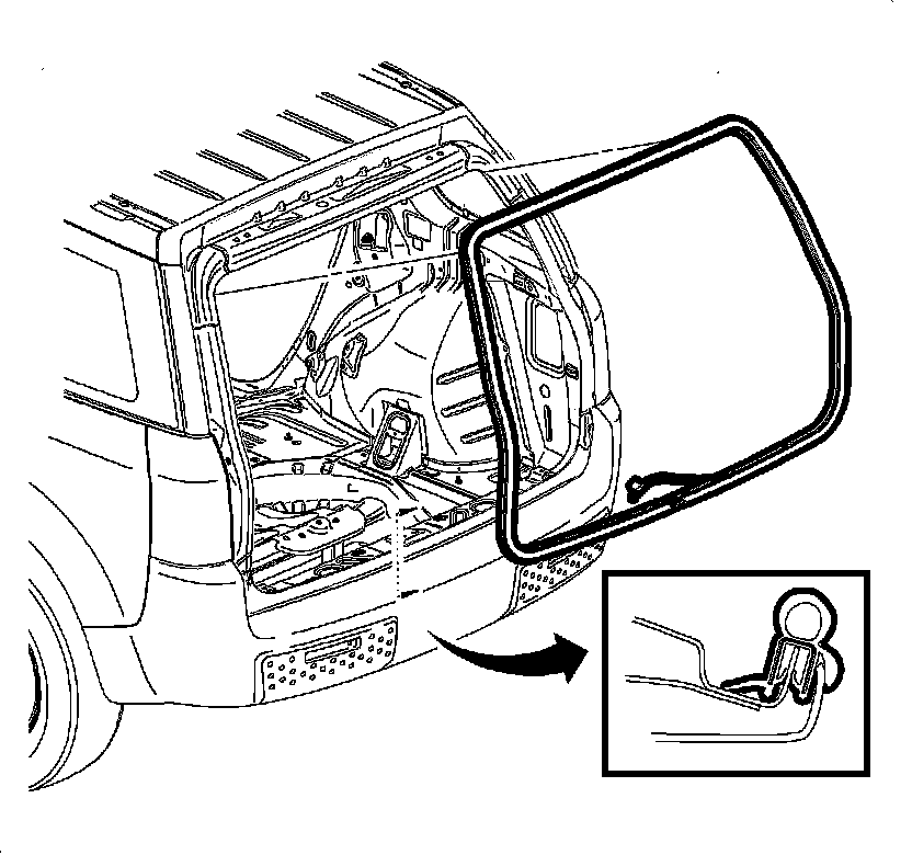 2. Pull the lift gate weatherstrip from the lift gate opening pinch-weld flange by starting at the joint at the bottom of the lift gate opening.