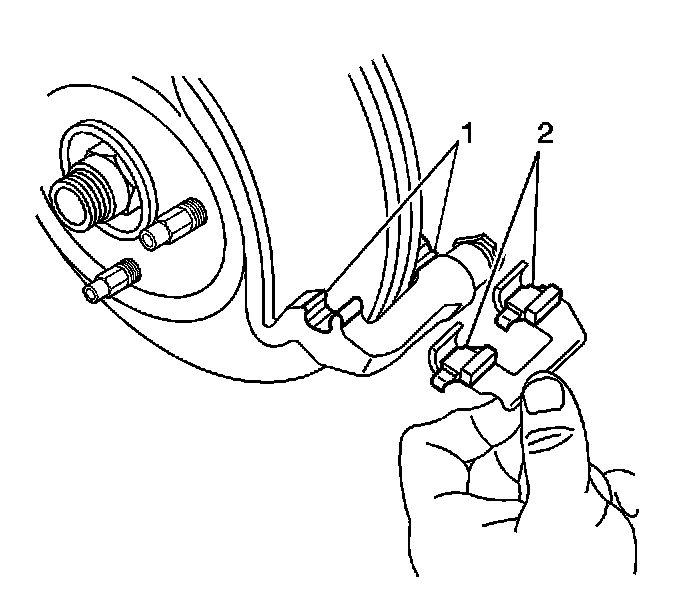 3. Remove the disc brake pad retainers (2) from the brake caliper bracket.